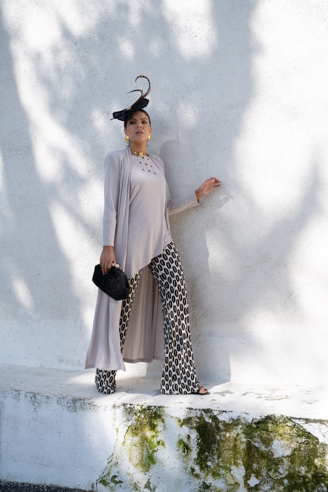 Levita extra larga con dos aberturas laterales, manga francesa. En color beige.