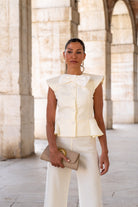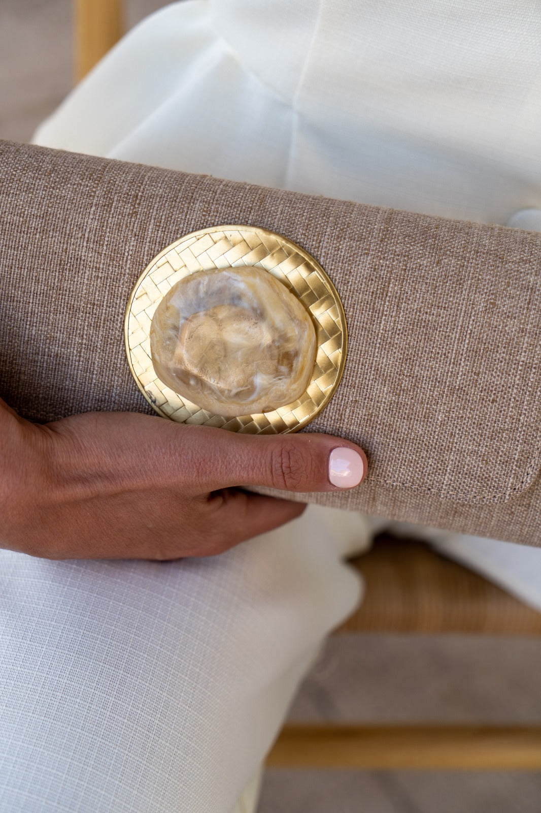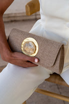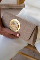 Bolso alargado, en tejido rugoso, detalle de piedra en el centro, cierre con imán, cadena dorada para colgar. En color beige oscuro.