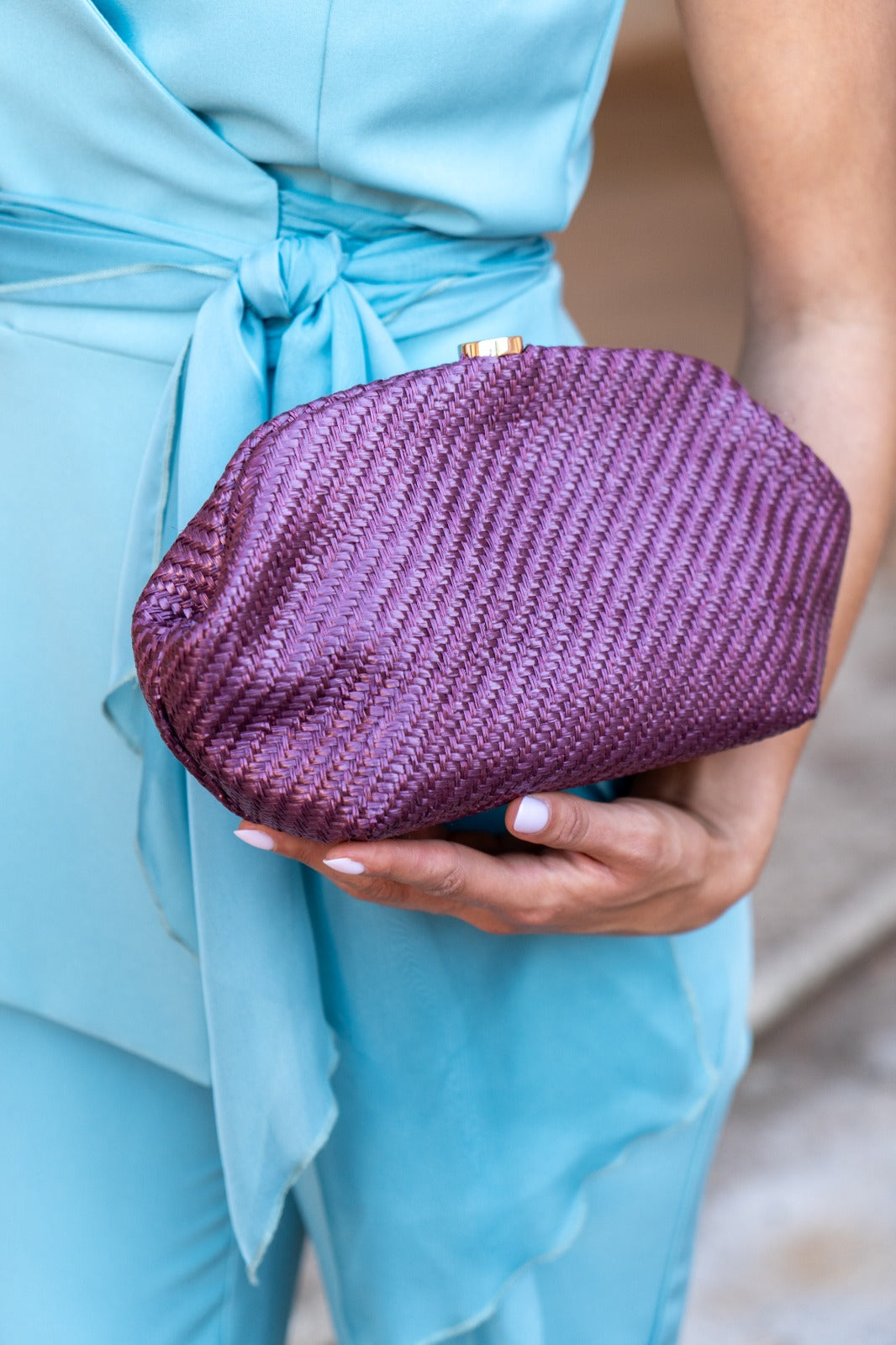 Bolso en tejido tipo ratán, cierre con imán, cadena dorada para colgar. En color morado.