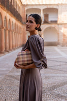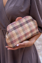 Bolso en tejido tipo ratán, cierre con imán, cadena dorada para colgar. En dibujos cuadrados de varios colores.