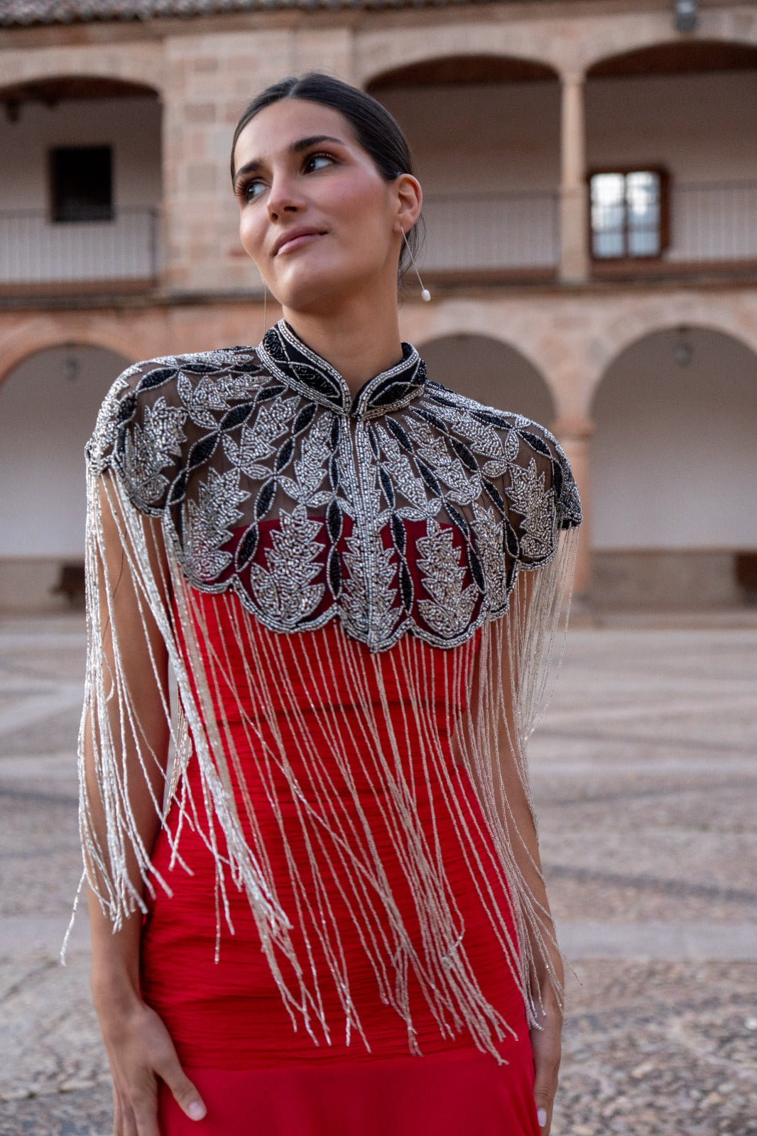 Capa corta, con la delicadeza de un abanico de finos flecos y bordados artesanales. En color negro y plateado.
