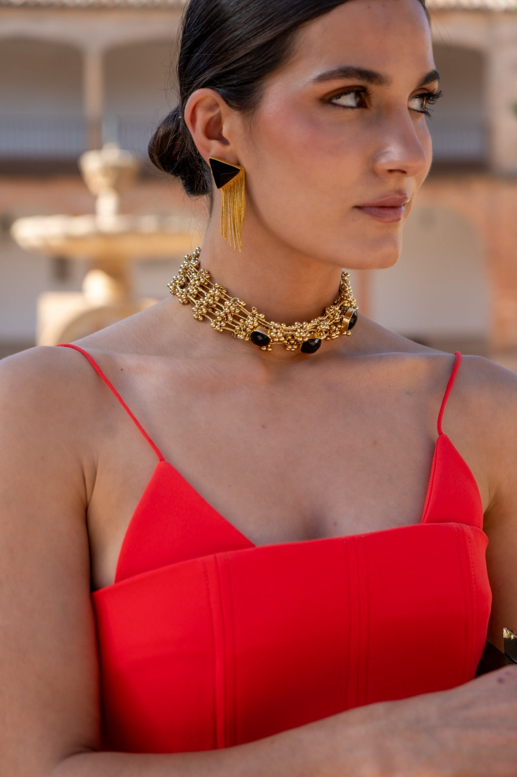 Gargantilla formada por hileras doradas y en el centro tres piedras negras.