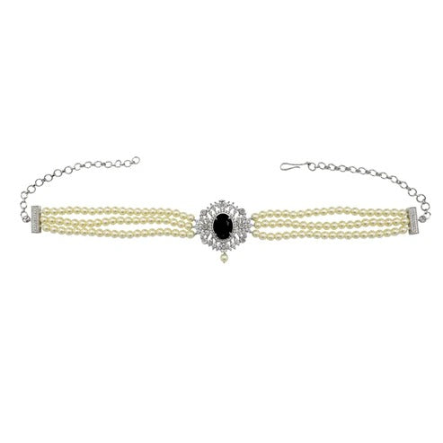 Choker compuesto por tres hileras de piedras, que abrazan delicadamente el cuello. En el centro, una pieza ovalada negra.