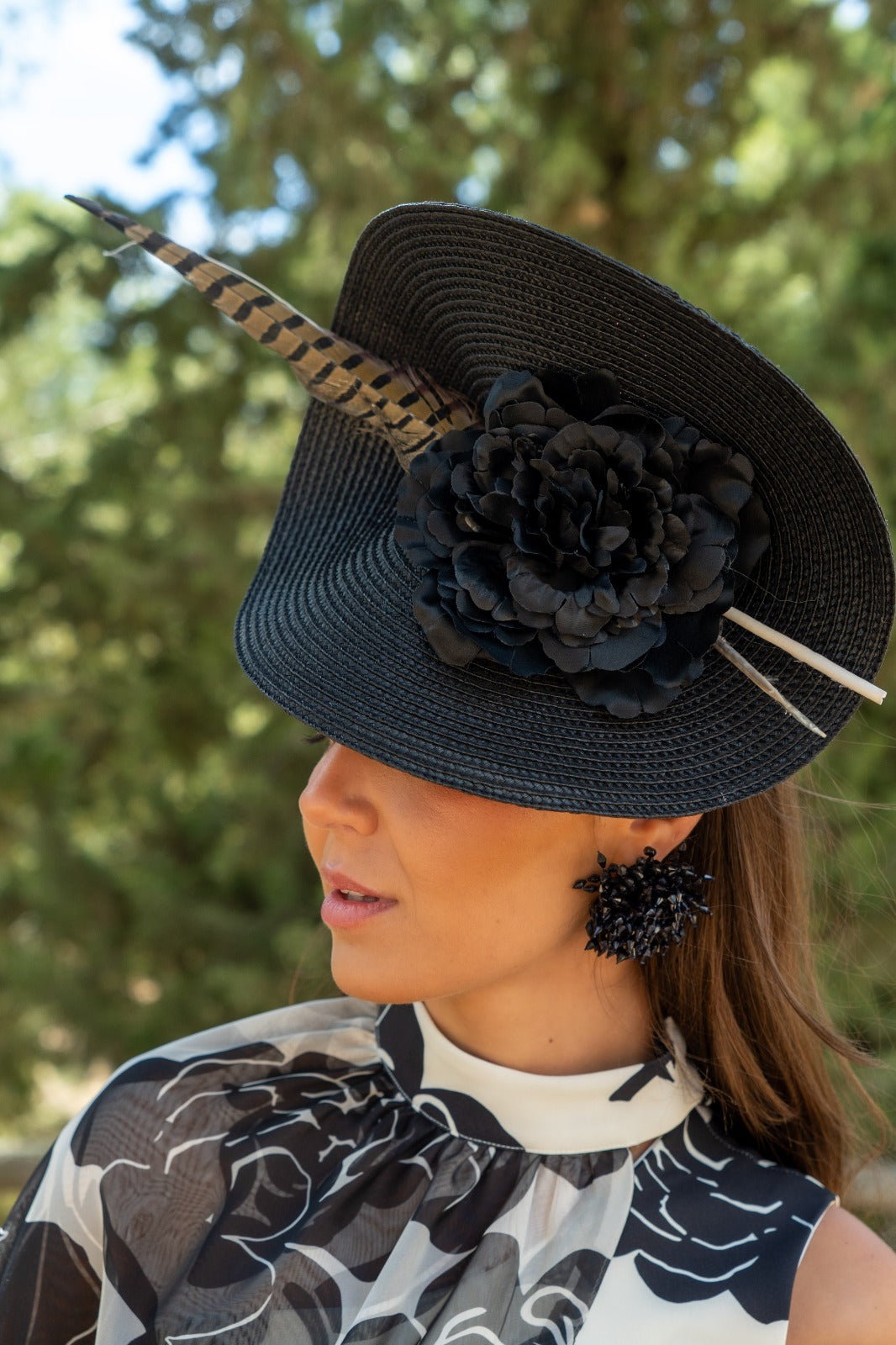 Tocado con base en poliester, con detalle flor y pluma, con diadema para sujeccion, en color negro.