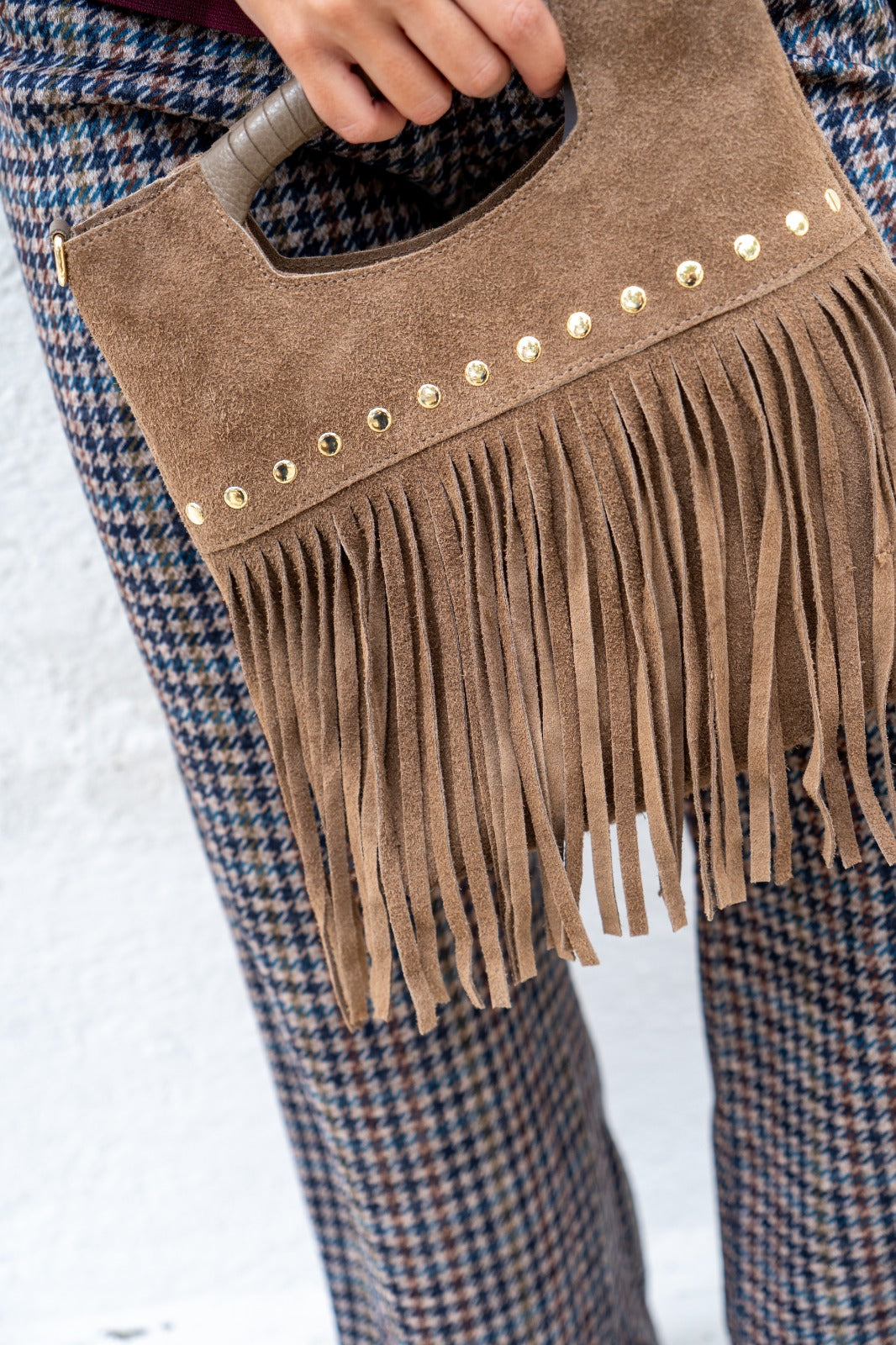 Bolso en ante, cierre con cremallera, asa corta, detalle flecos y tachuelas. En color marrón.