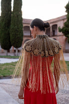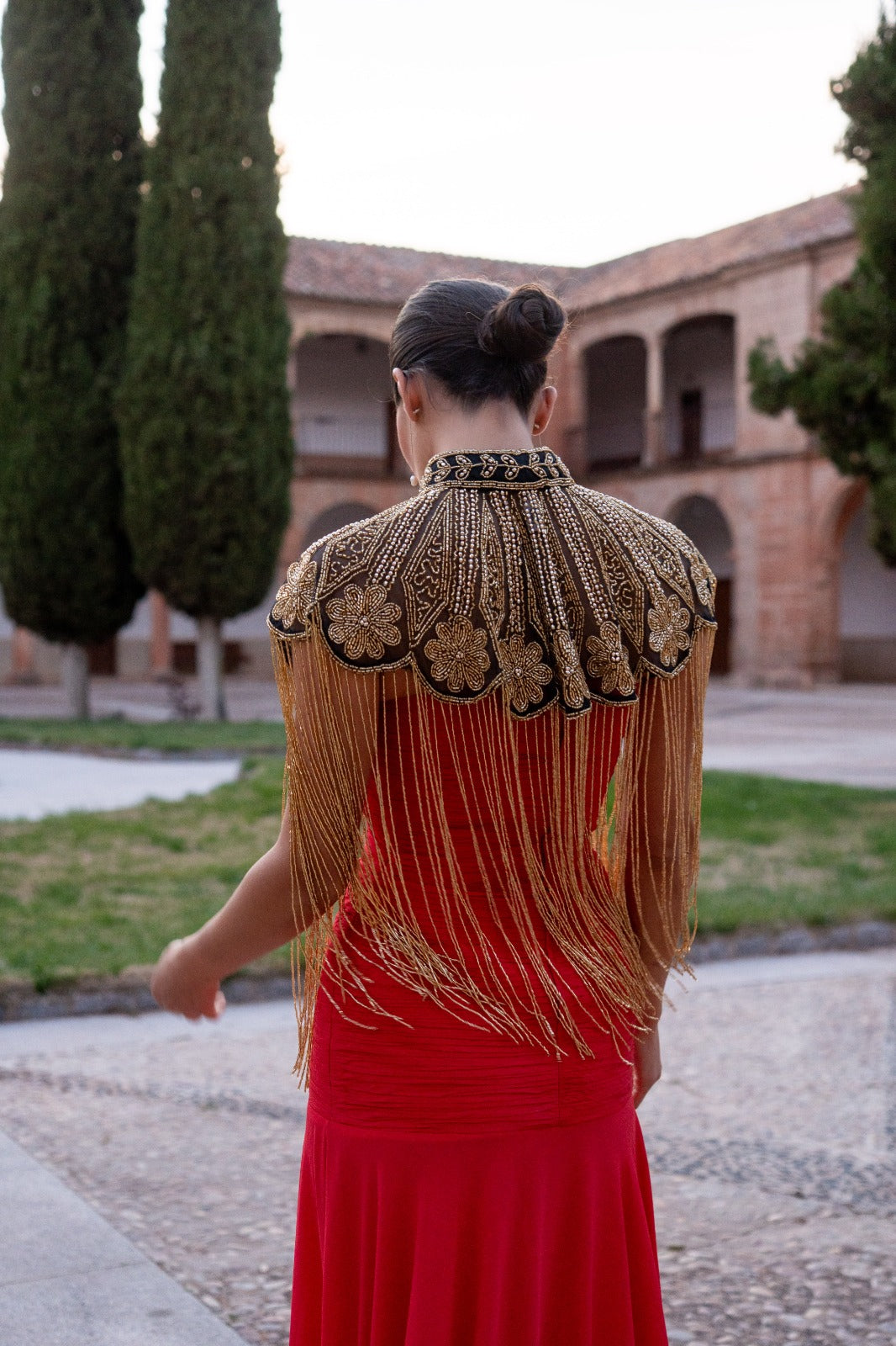 Capa corta, que abraza el cuello y cae en forma de abanico con delicadas lineas y detalles que recuerdan a flores y motivos clásicos. En color negro y dorado.