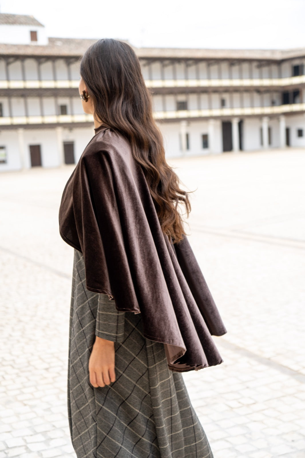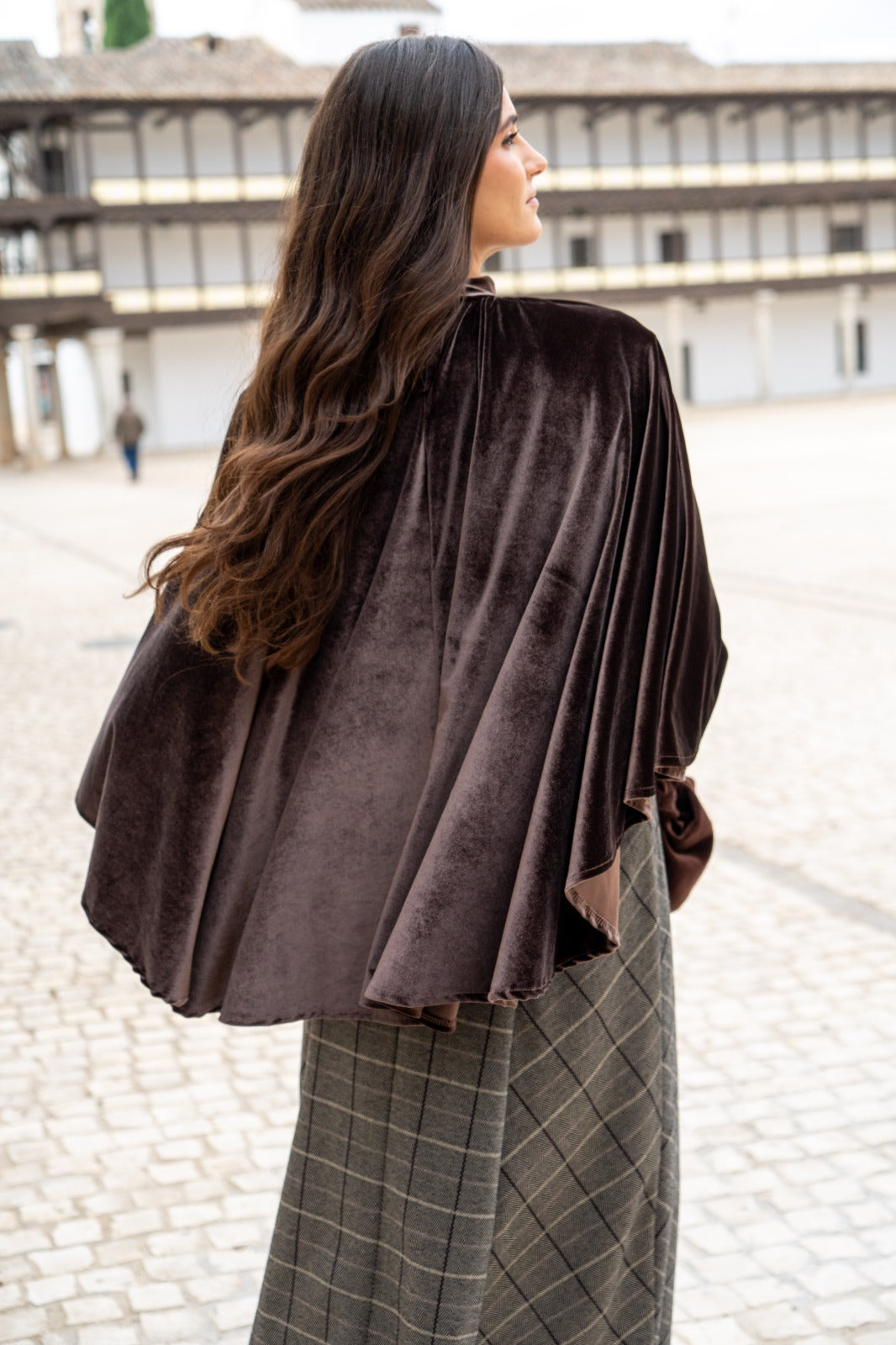 Capa corta, en terciopelo, cuello perkins, abierta en la parte delantera, cerrada por la parte trasera, abrochada con dos botones. En color marron.