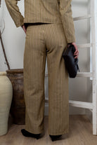Conjunto compuesto por chaqueta corta, escote redondo, abotonada, manga larga abullonada y pantalón tiro alto, pinzas delanteras y bolsillos laterales. En color mostaza con raya blanca.