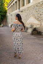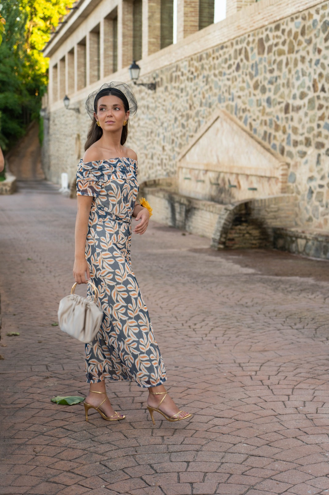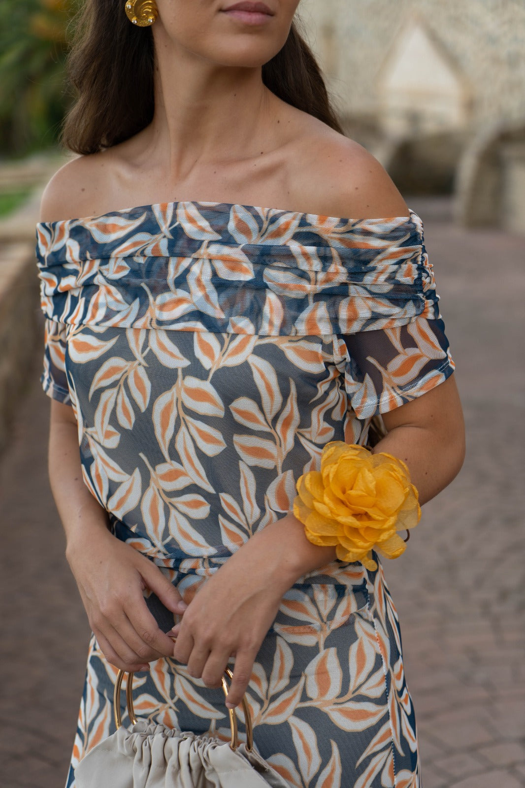 Vestido midi, hombros descubiertos, manga corta, totalmente elastico. En color beige y marino.