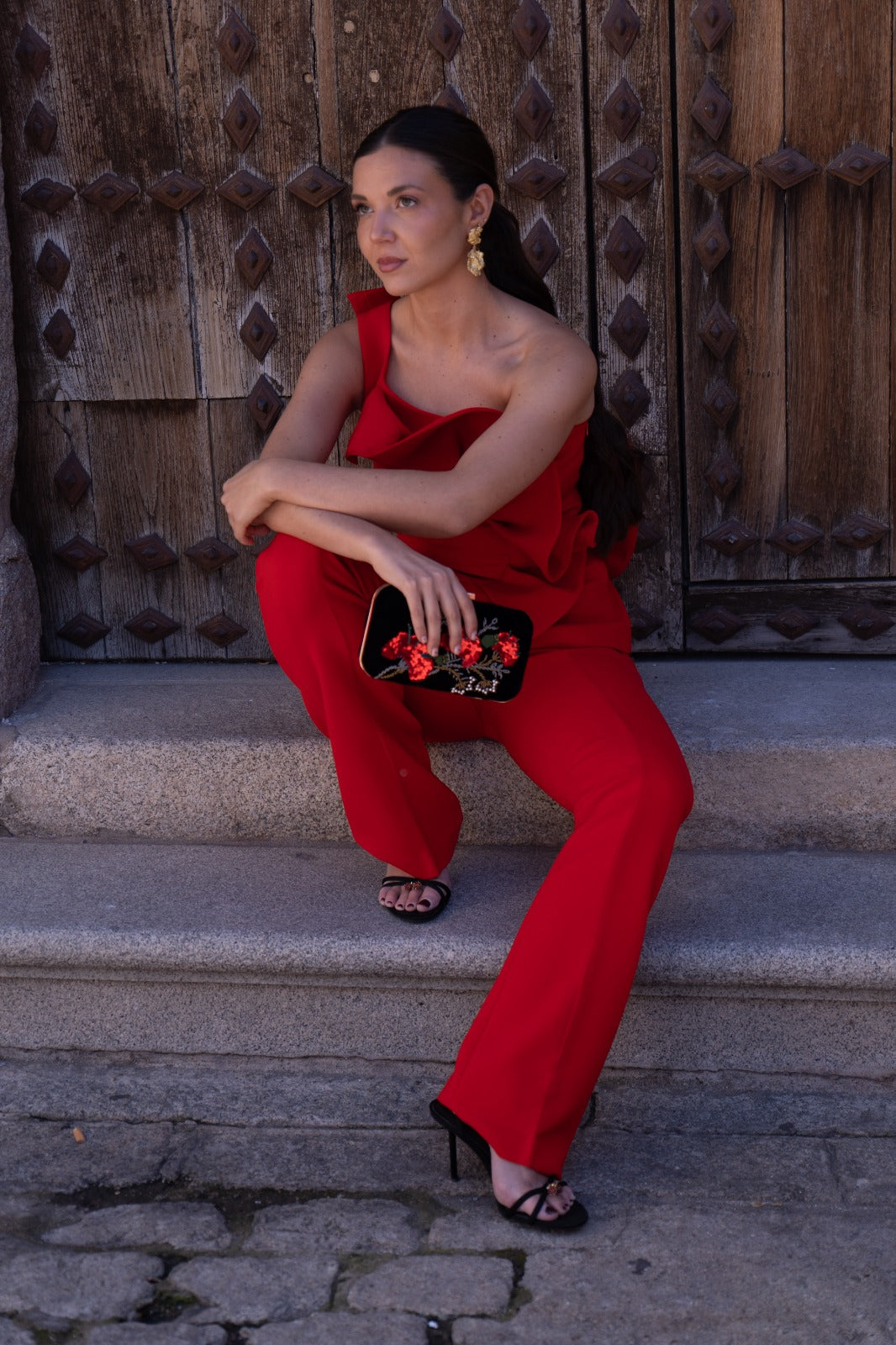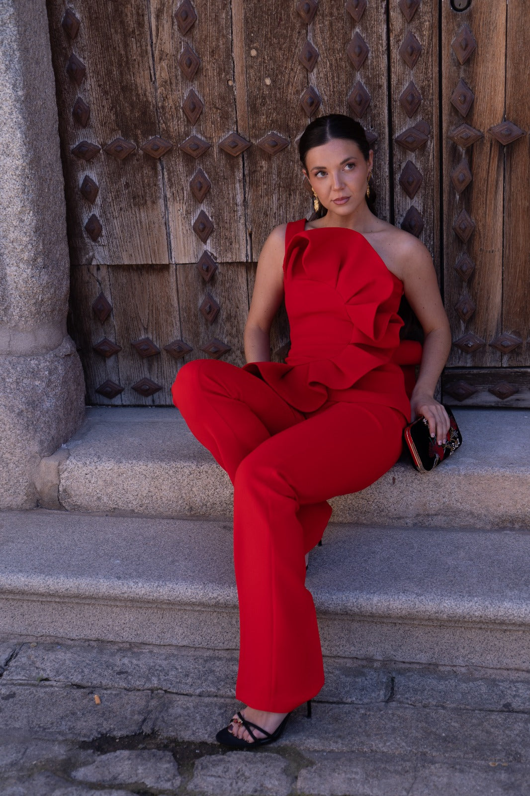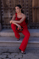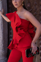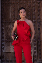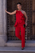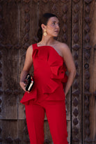 Conjunto compuesto por top escote redondo, sin mangas, detalle volante delantero y trasero a un lado y pantalón cintura alta, estrecho. En color rojo.