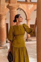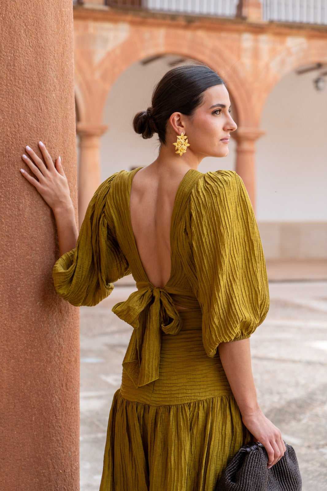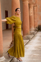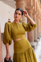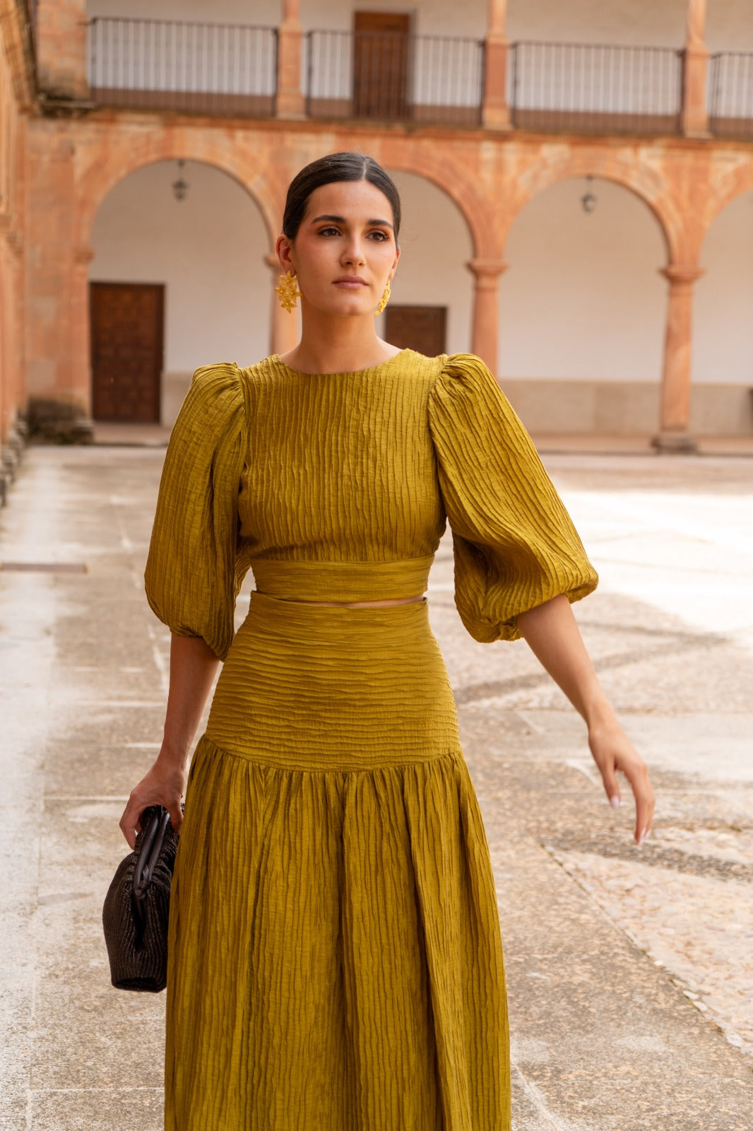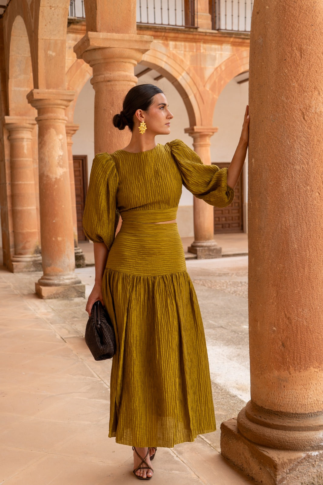 Conjunto compuesto por top, escote redondo, manga francesa con puño, espada abierta con nudo y falda alta, entallada y vuelo abajo, en color oliva.