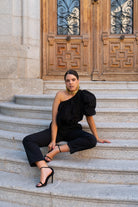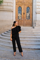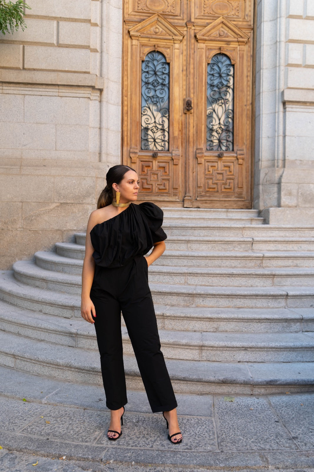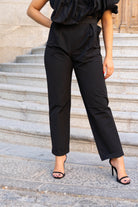 Pantalón confeccionado en tafeta negro, tiro alto y corte recto con bolsillos laterales. Cierre con cremallera invisible lateral. Combinalo con nuestro Top Arte.