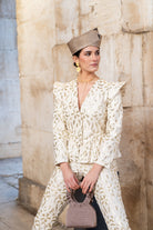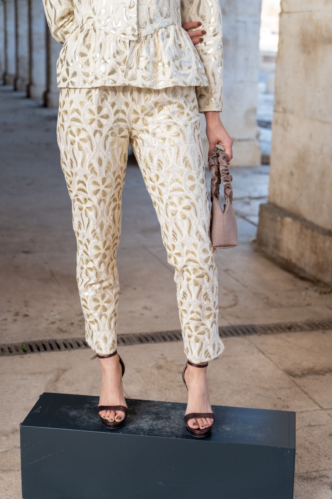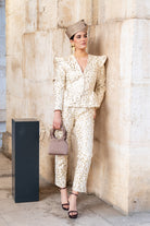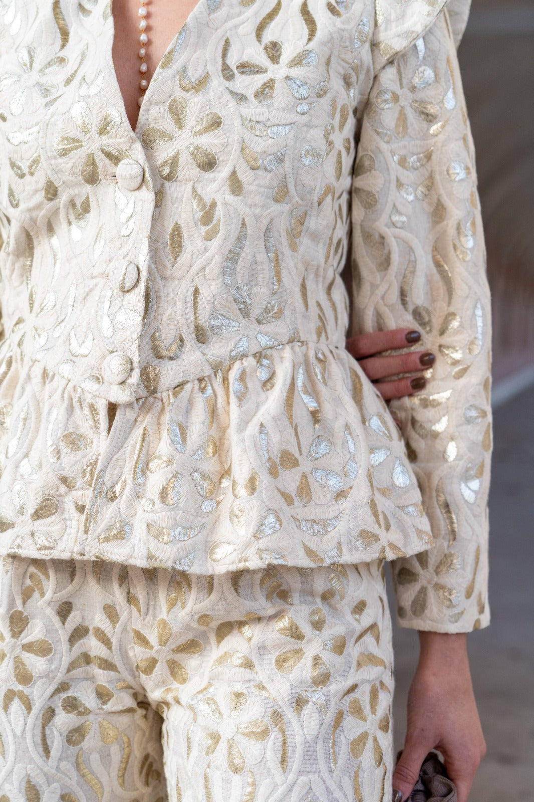 Conjunto compuesto por chaqueta entallada, escote en pico y hombros estructurados, incorpora mangas desmontables mediante cremallera invisible en la sisa, permitiendo transformar la prenda en chaleco. Pantalón corte recto, bolsillos laterales, pinzas. Bordado marfil con delicados motivos florales en relieve.