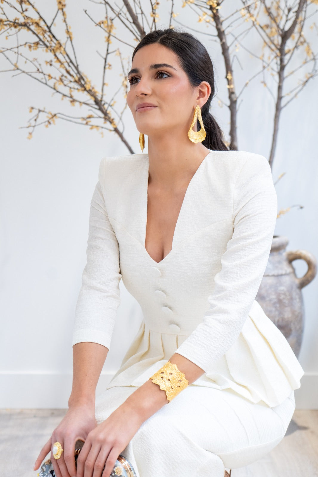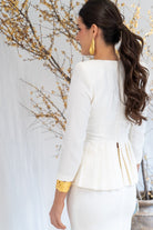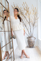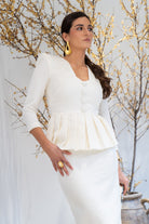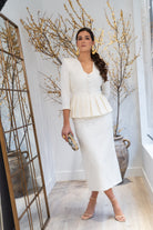 Conjunto compuesto por blusa escote corazon, manga francesa, detalle botones centrales, peplum con tablas en cintura y falda alta con abertura trasera. En color beige.