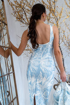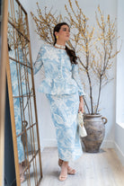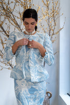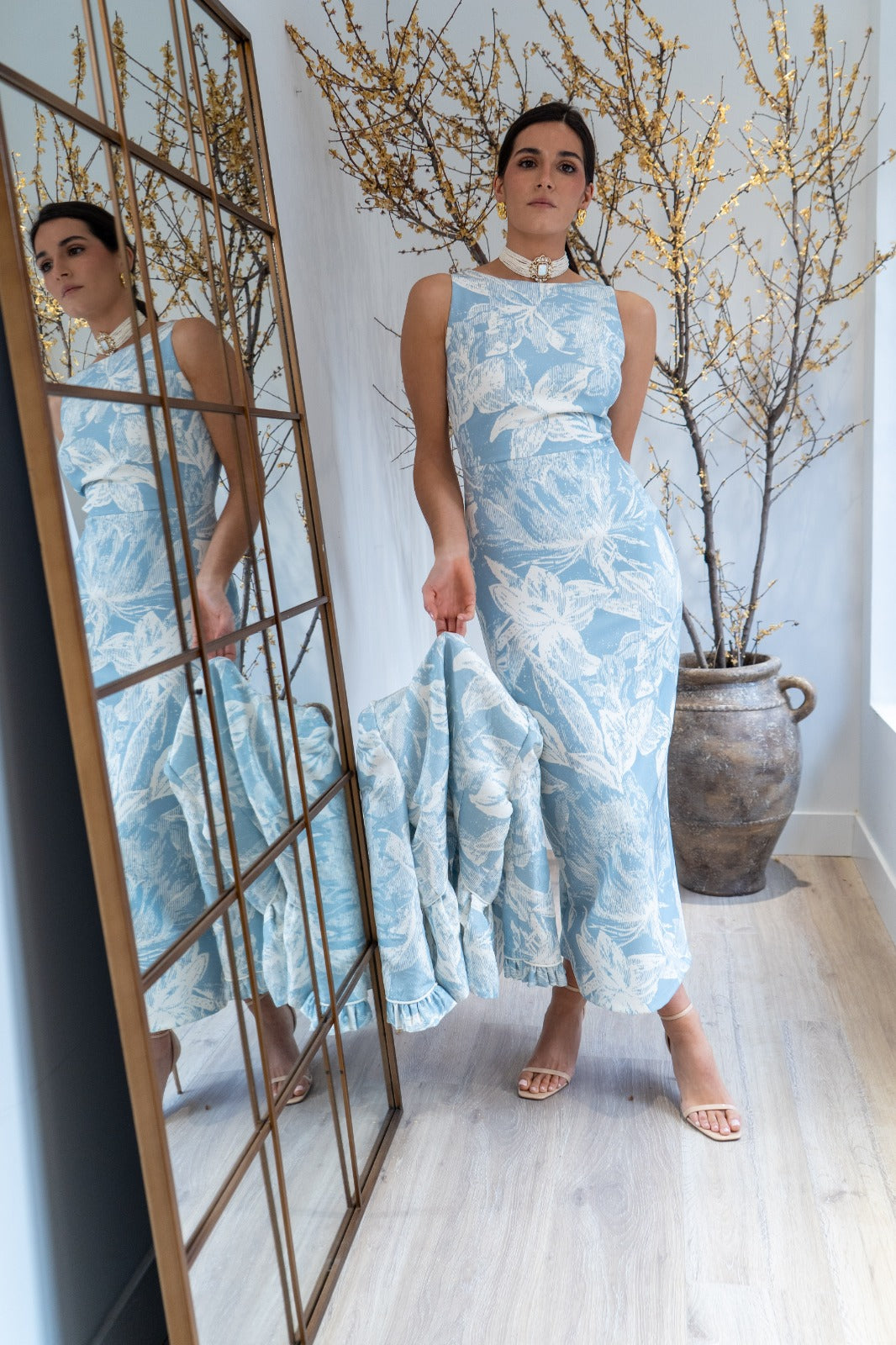 Conjunto compuesto por  dos piezas, vestido escote redondo, sin mangas, abertura trasera y chaqueta manga francesa, abotonada, peplum en cintura. En color estampado azul y beige.