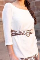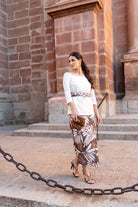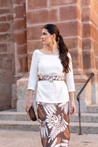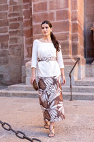 Conjunto compuesto por blusa escote redondo, manga francesa y falta cintura alta, abertura trasera, cinturón del mismo tejido incluido. En color beige y falda estampada en tonos marrones.