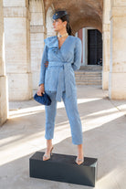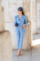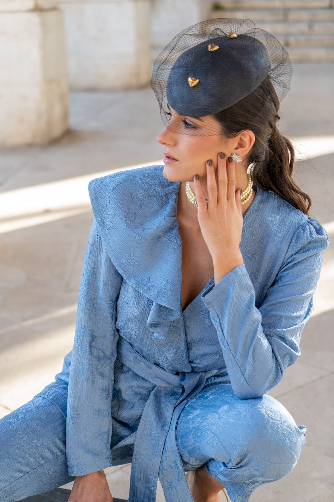 Conjunto compuesto por chaqueta cruzada con cinturón y volante en un lado, manga larga y pantalón tiro alto estrecho. En color azul con brocado.