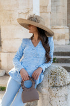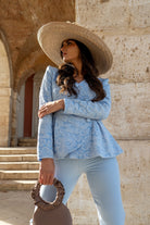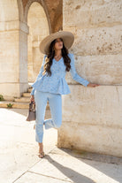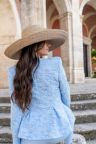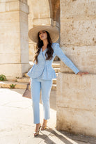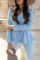 Conjunto compuesto chaqueta brocada, manga larga, cruzada con botones y peplum. Pantalón con cintura, tiro alto. En color azul.