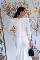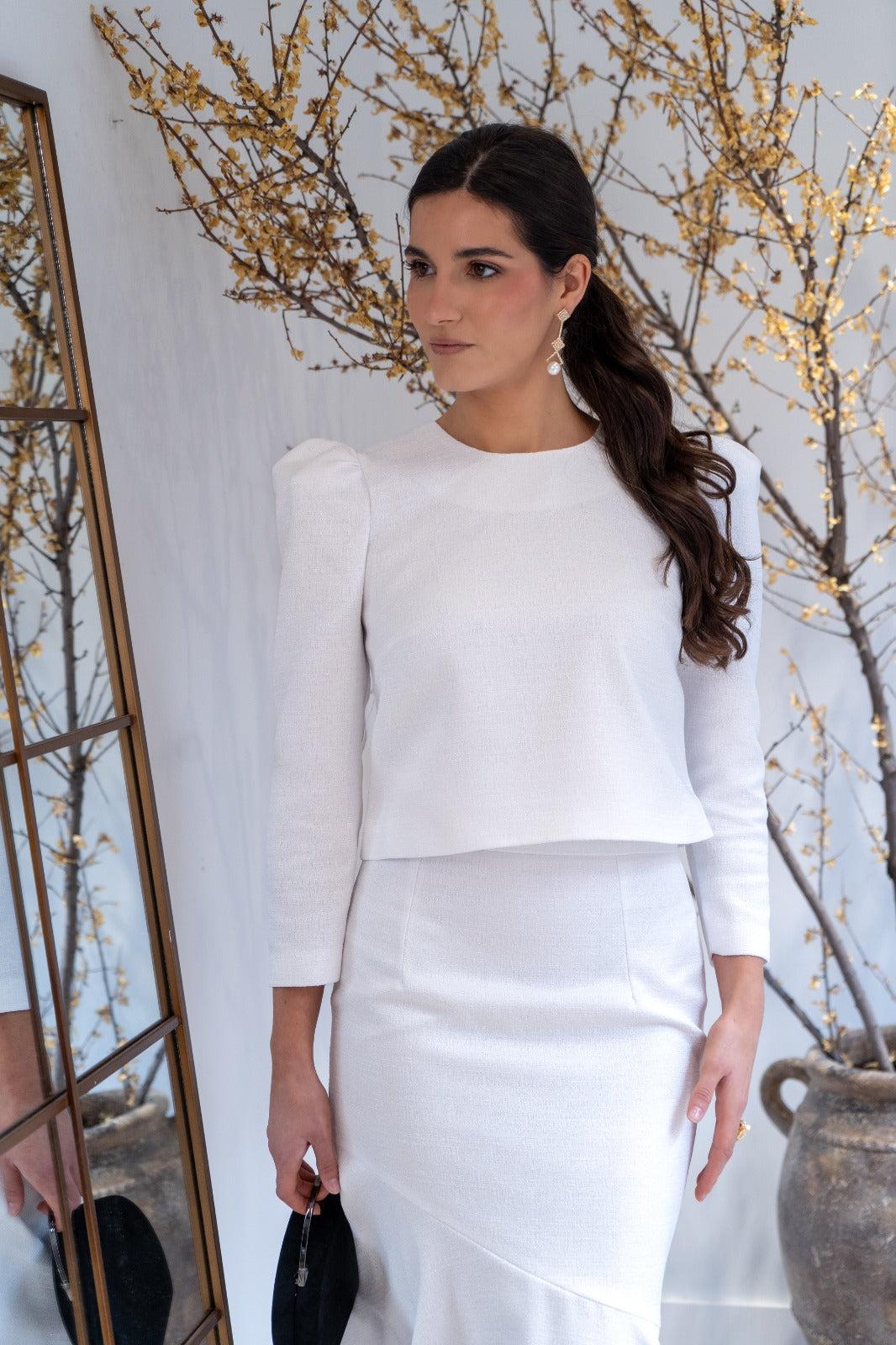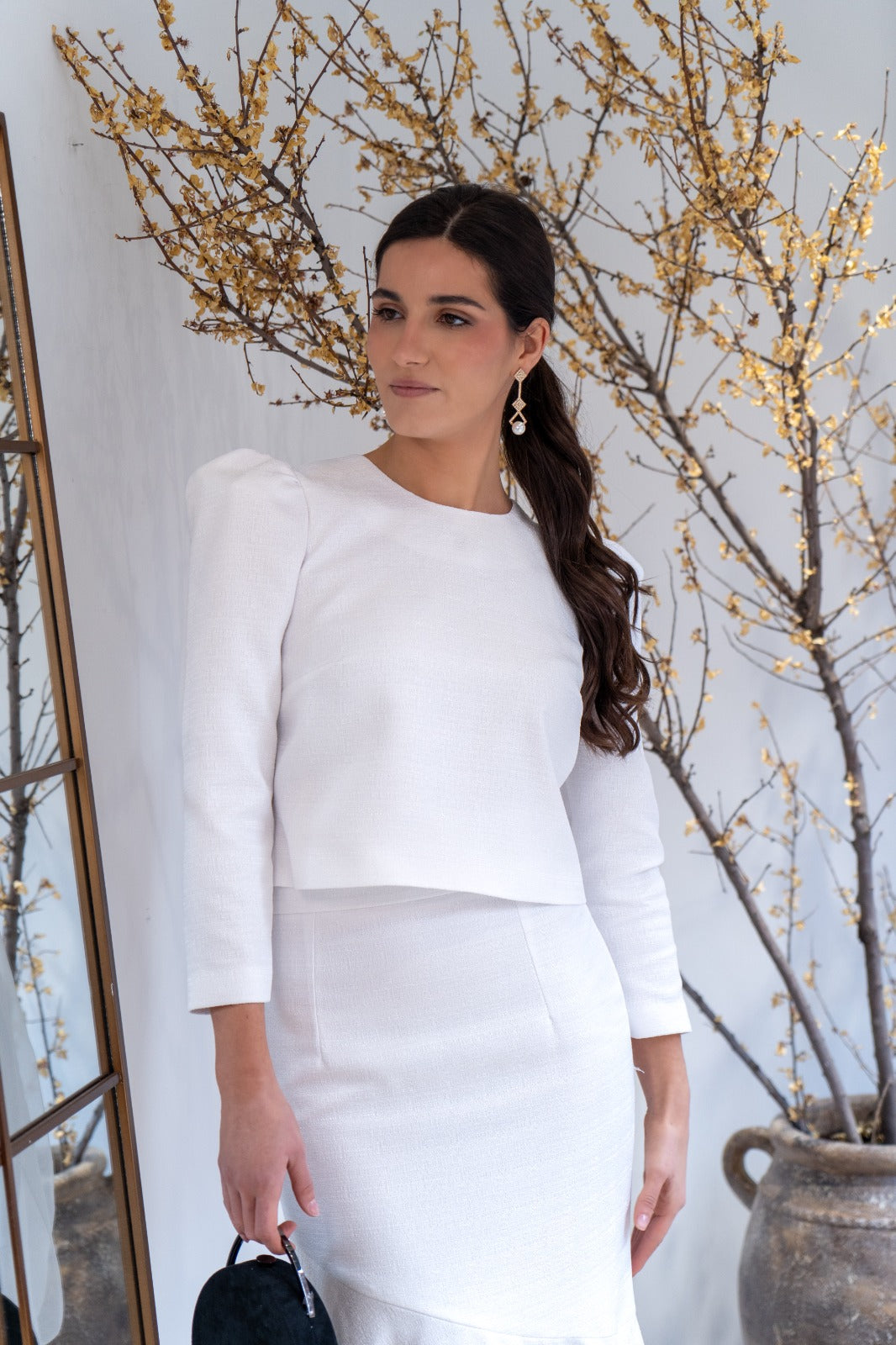 Conjunto compuesto por top escote redondo, manga larga, abotonado en la espalda, lazo en cuello para anudar y falda alta, corte sirena, volante asimétrico. En color blanco.