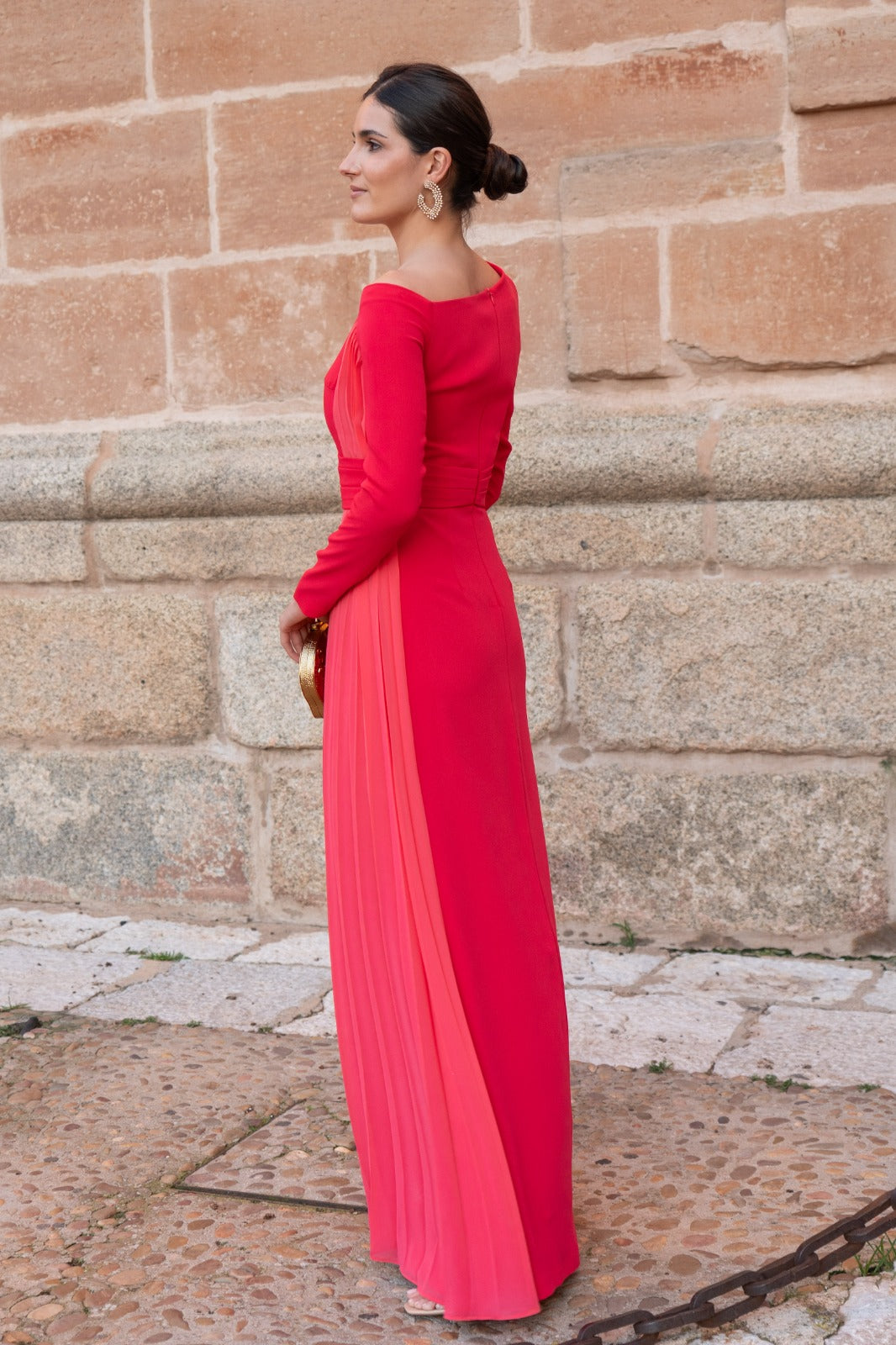 Vestido largo, escote asimétrico, corte en cintura con cinturón, manga larga, caída plisada en un lado. En color frambuesa.