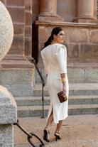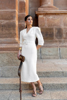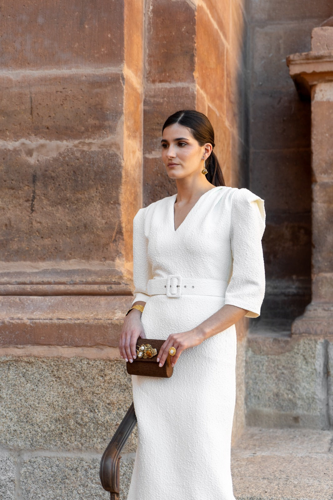Vestido midi, escote a pico, manga francesa con hombrera marcada, corte en cintura con cinturón, abertura trasera. En tejido rustico color beige.