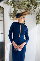 Vestido midi, escote redondo subido con tira transparente, manga francesa, abertura trasera. En color azul.