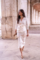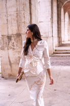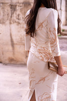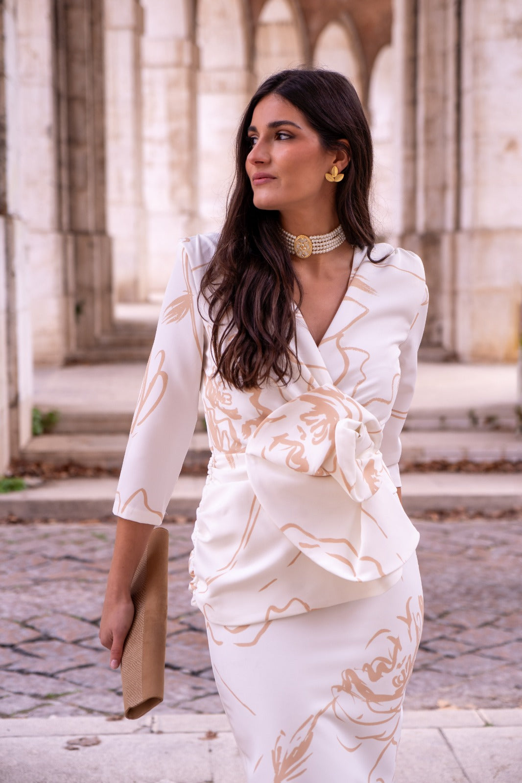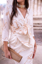 Vestido escote cruzado, manga francesa, peplum y detalle flor delantera en cintura, abertura trasera. En color blanco con estampado.