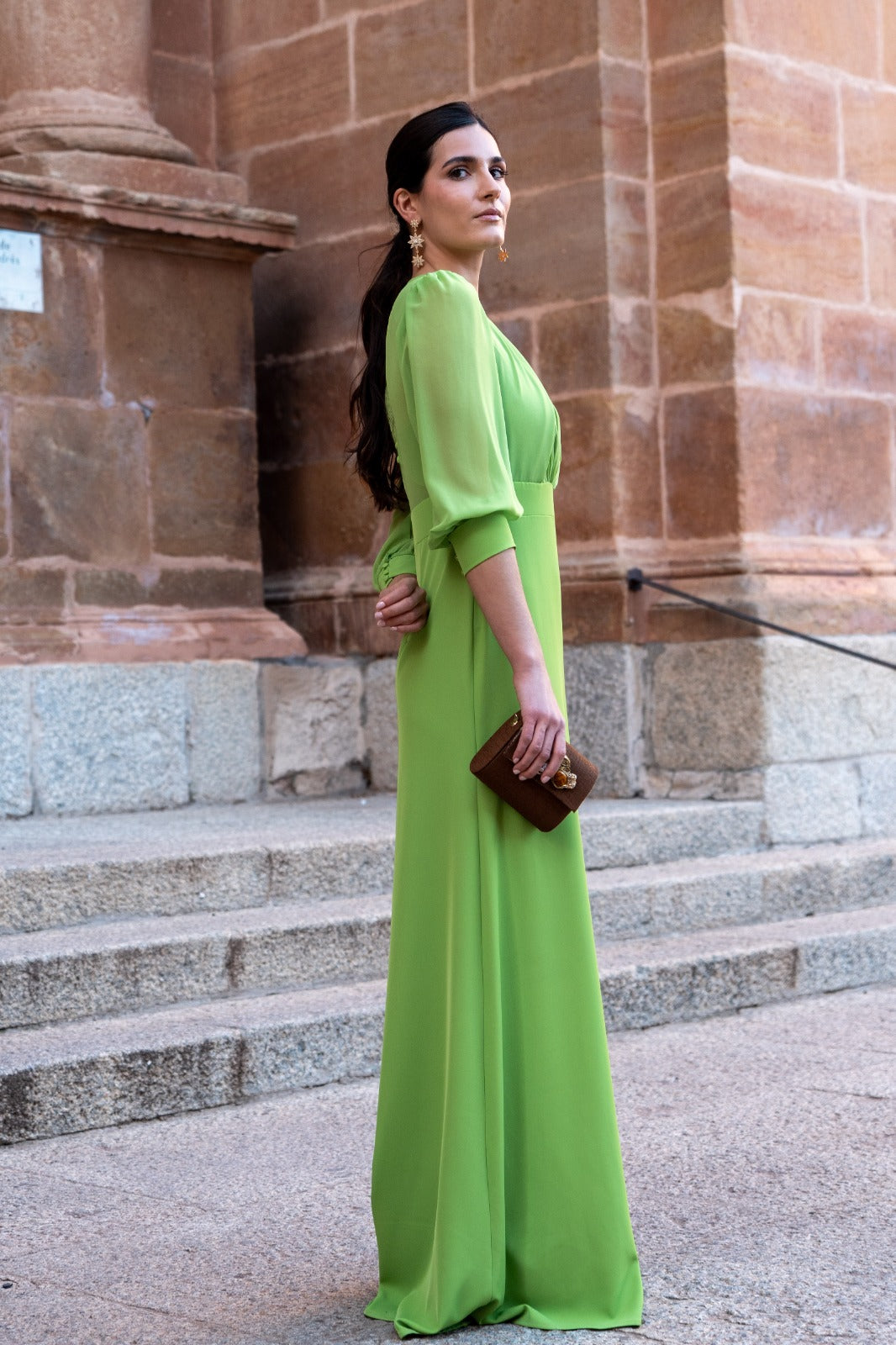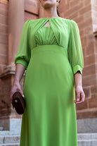 Vestido largo, escote redondo con pequeño escote, parte trasera abotonada, manga francesa en gasa con puño, corte en cintura, fluido. En color verde.