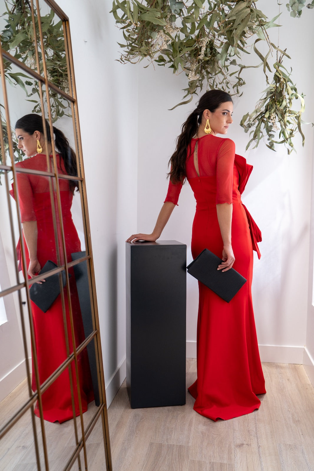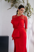Vestido largo, escote redondo, parte de arriba en gasa, detalle lazo tafetán en la parte delantera, abertura delantera a un lado, En color rojo.