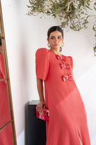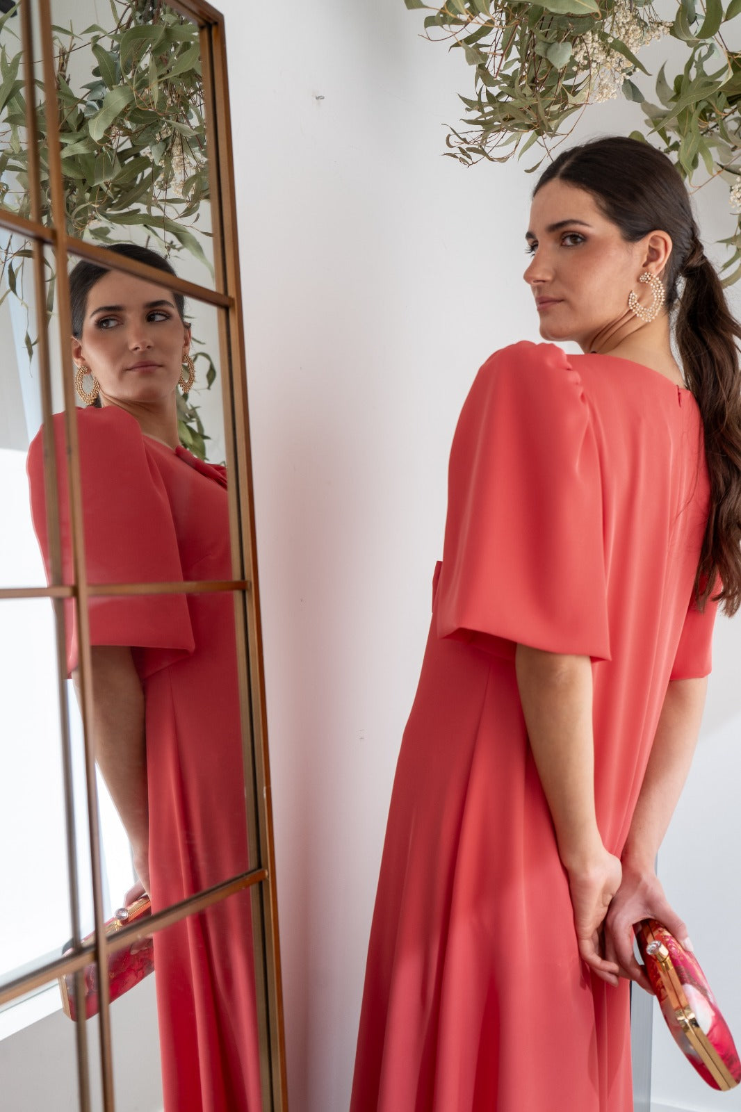 Vestido midi, escote redondo, manga corta ancha, oversize, detalle lazos delanteros, bolsillos, con forma a los lados, abertura delantera. En color coral.