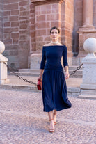 Vestido midi, escote bardot, manga francesa, fruncido en cintura, y falda fluida con vuelo. En punto seda color azul.