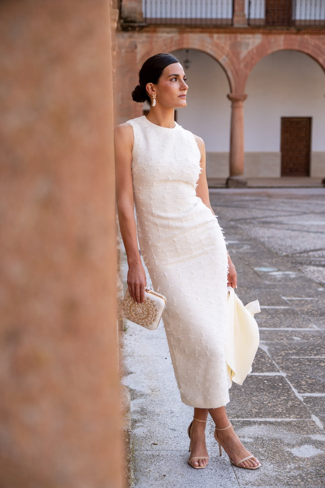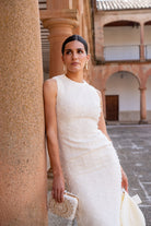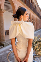 Vestido midi, escote redondo, sin mangas, recto, abertura trasera, capa estructurada con lazo, se puede quitar. En color beige.