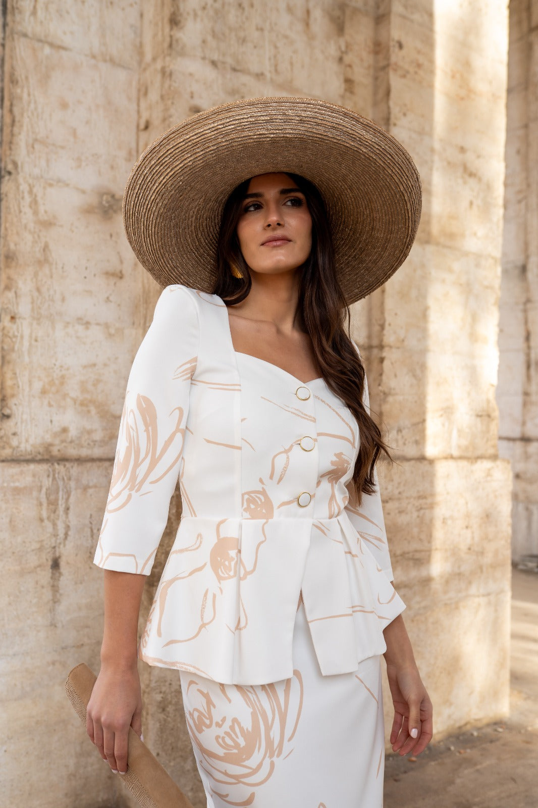 Vestido maxi midi, escote corazón, manga francesa, peplum en cintura, abotonado, abertura trasera. En color blanco con estampado camel.