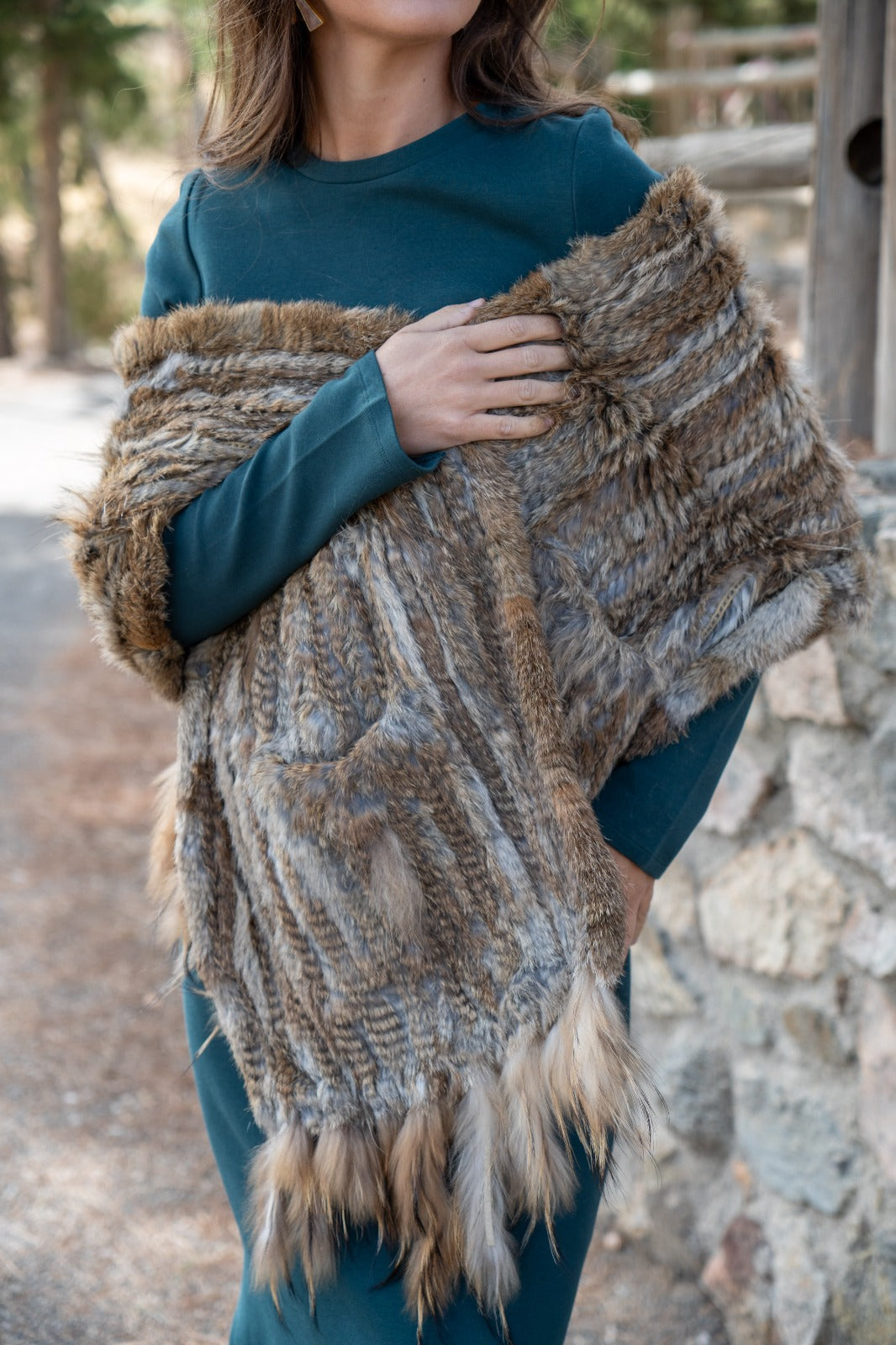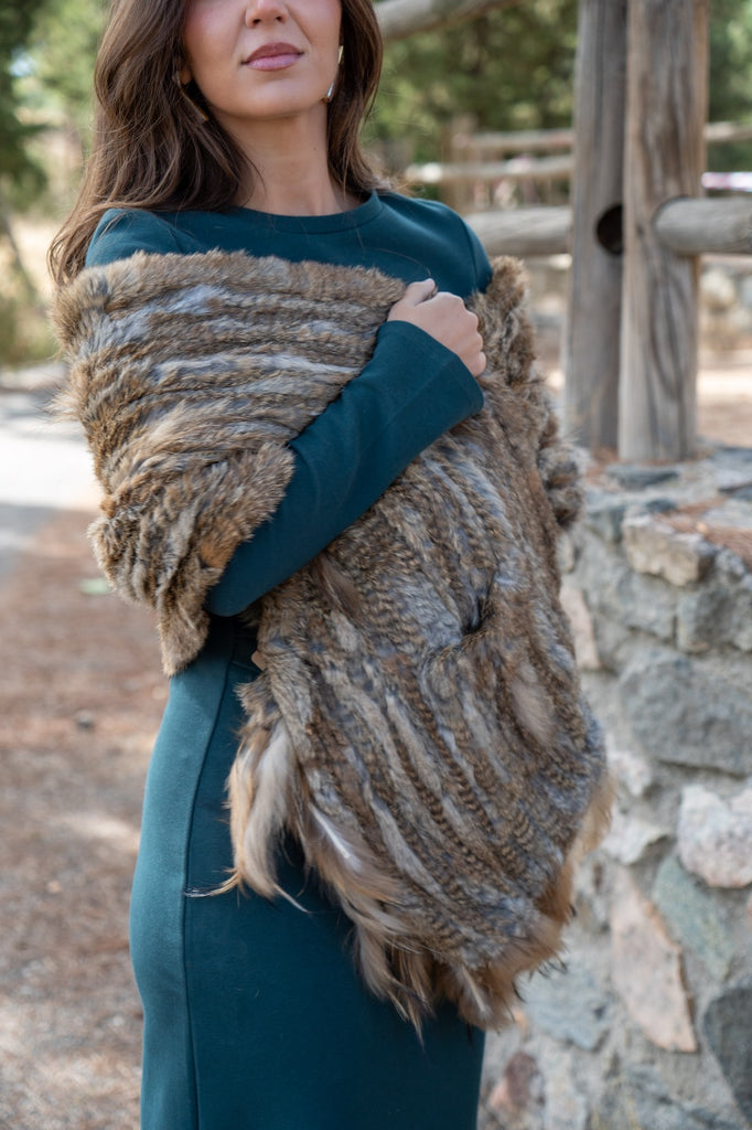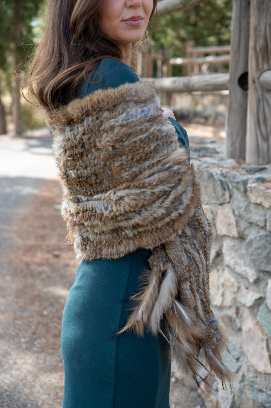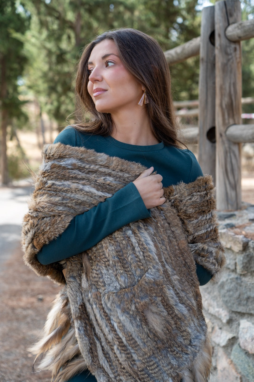 Estola en piel, con flecos en las terminaciones, multicolor en tonos marrones.