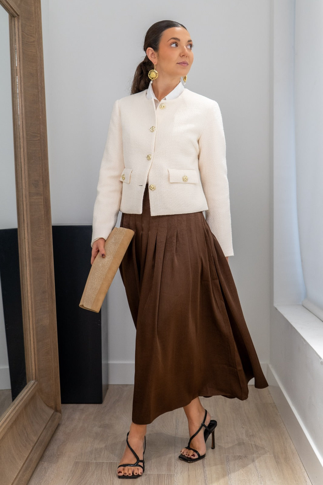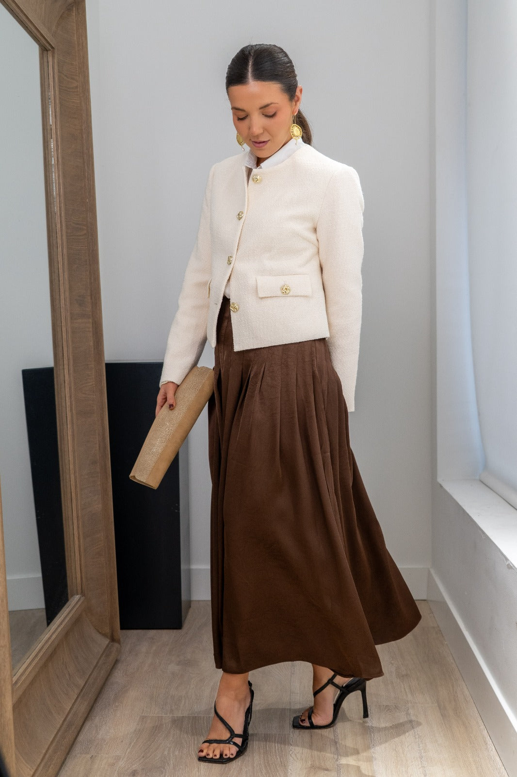 Falda midi, cintura alta, plisada, fluida con movimiento. En color marrón.
