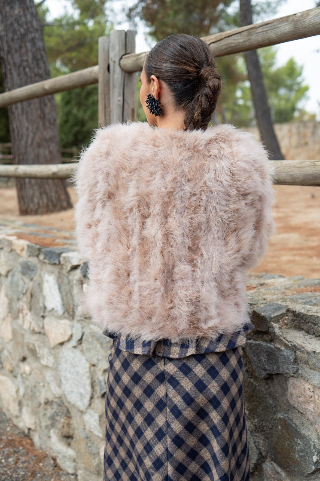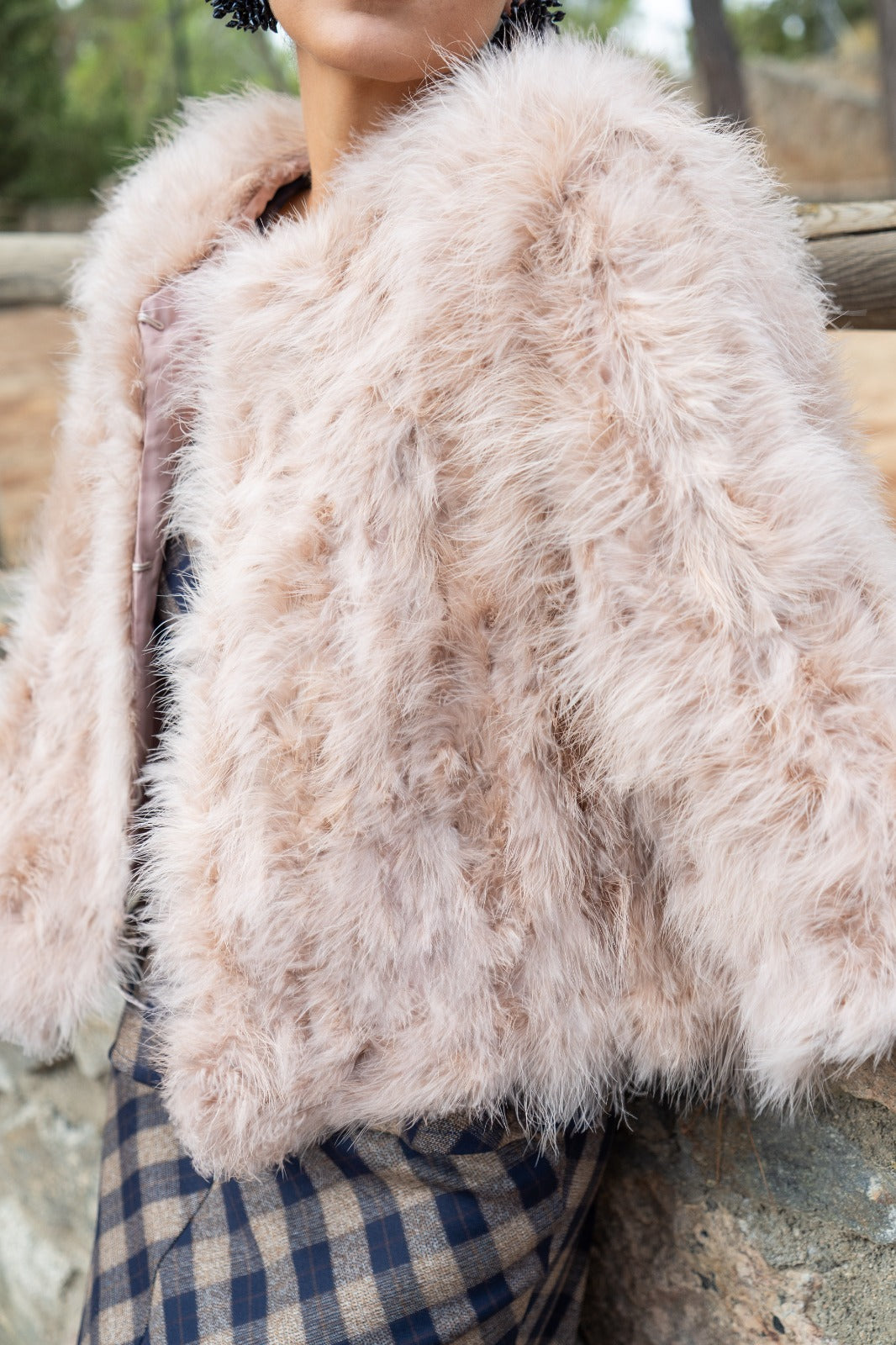 Chaqueta corta, cuello redondo, bolsillos laterales, en marabú color rosa.