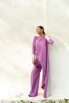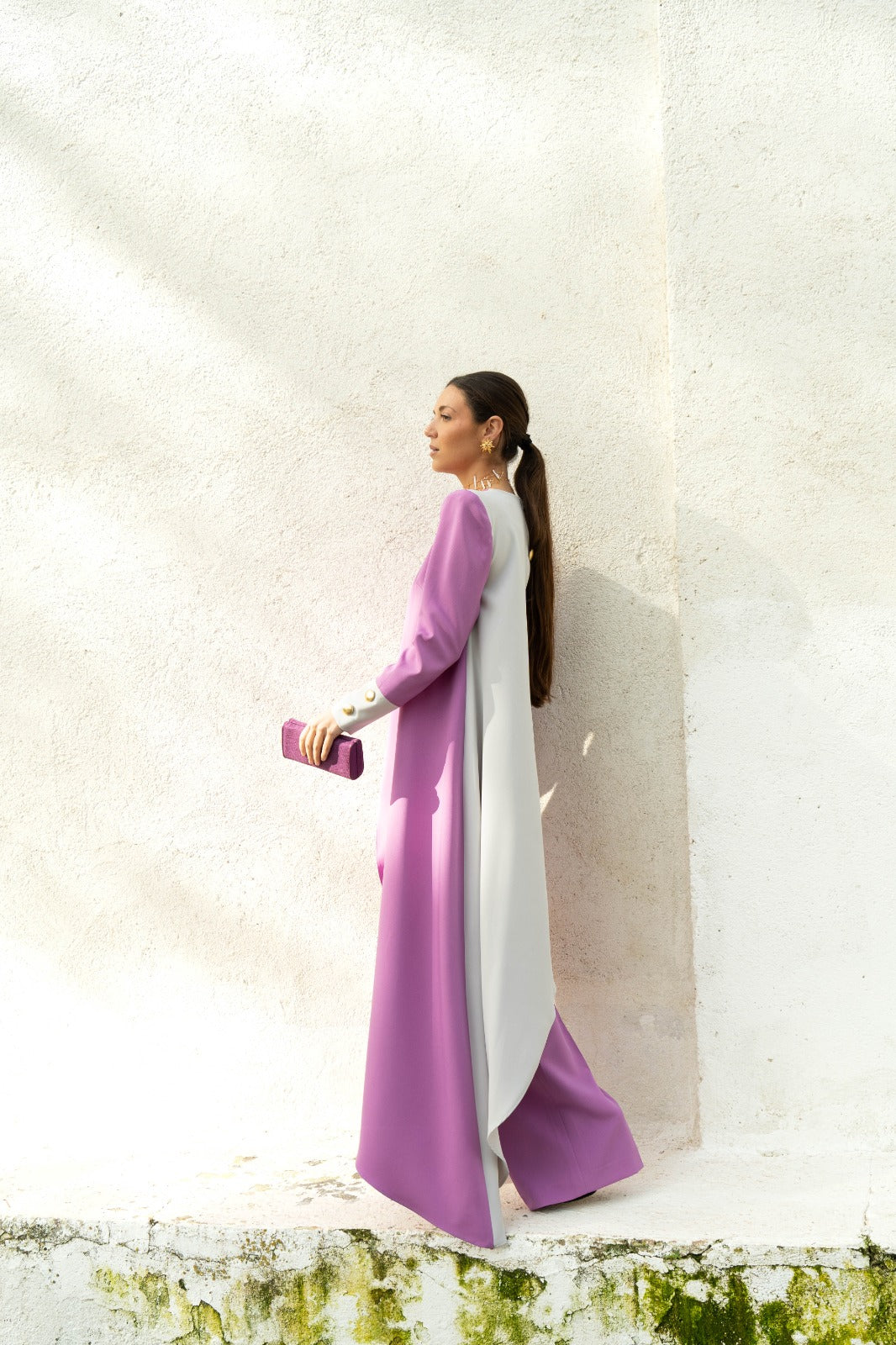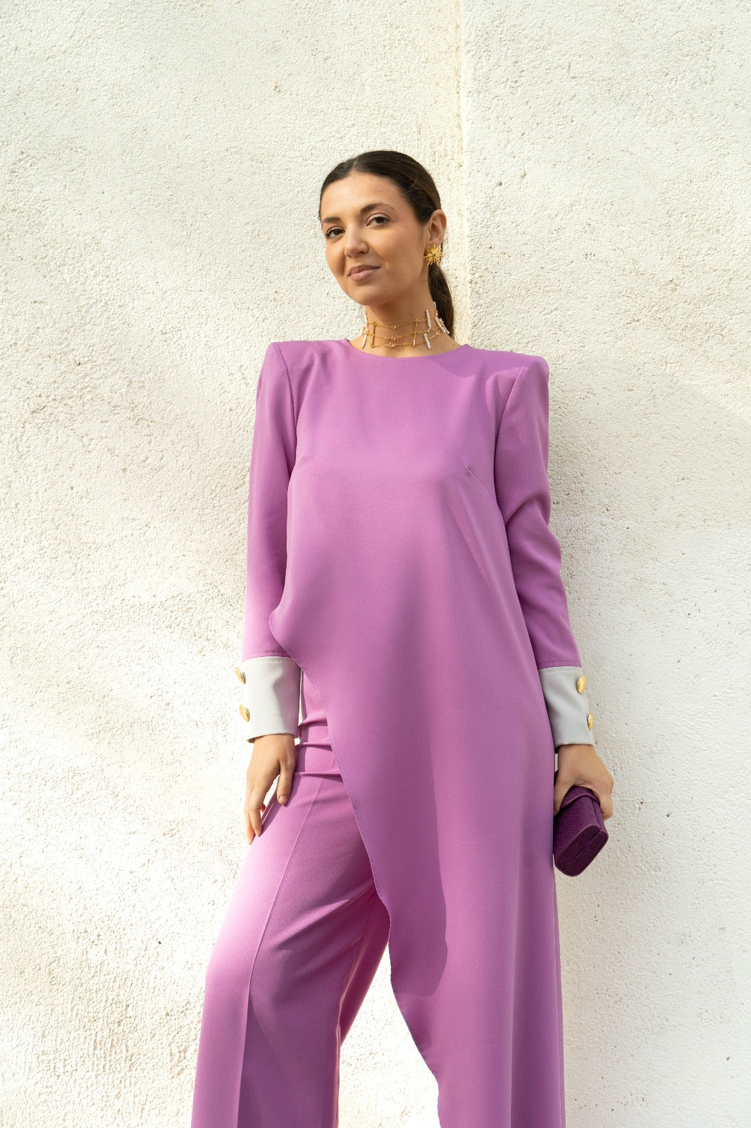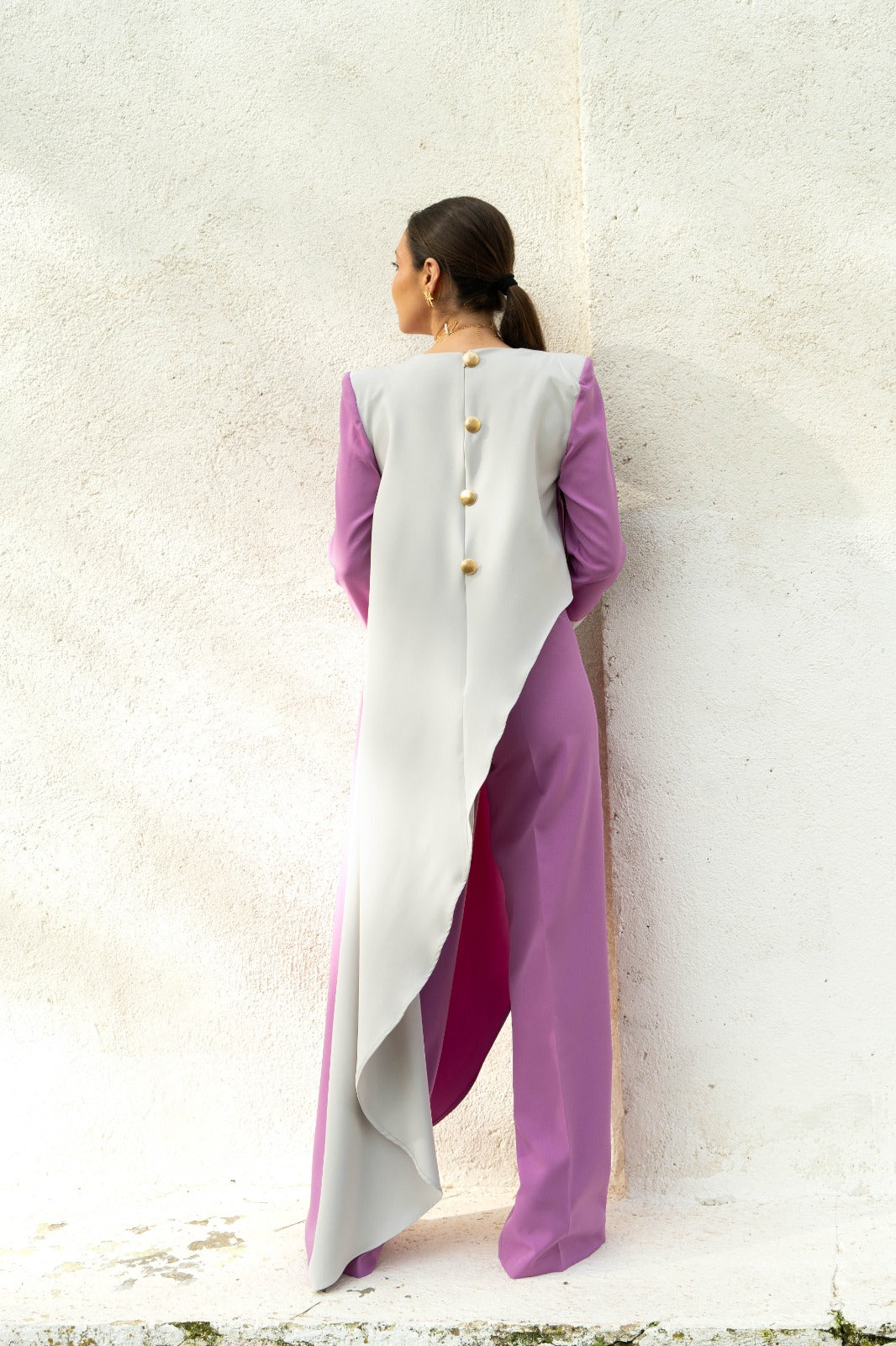 Conjunto bicolor, formado por dos piezas: Top asimétrico con hombreras ochenteras y capa lateral. Puños a contraste con detalle de botones dorados. La espalda también lleva como detalle los mismos botones, y todo ello irá combinado con un pantalón Palazzo del mismo tono que la parte delantera del top.
