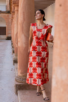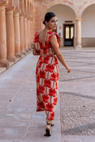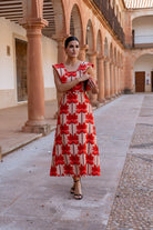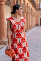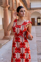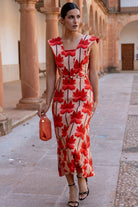 Vestido midi, escote cuadrado, sin mangas y alerones en forma de V, corte en cintura con cinturón. En lino con estampado de palmeras.