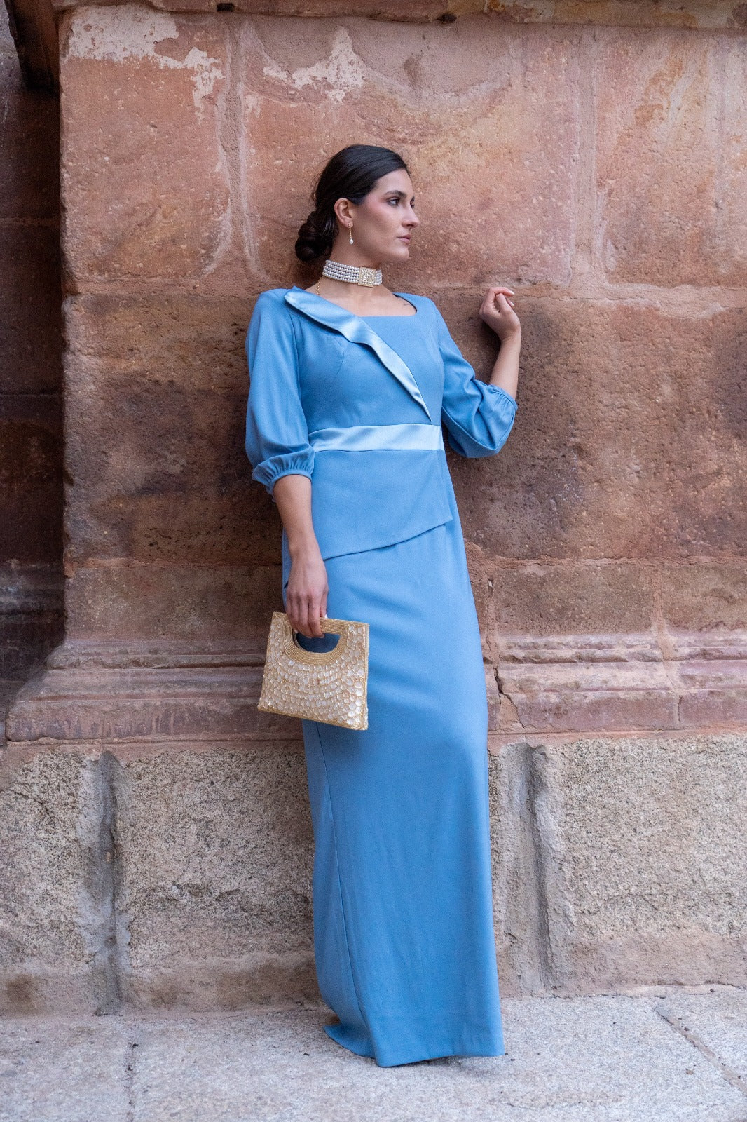 Vestido largo, escote cuadrado con detalle tira en satén, manga francesa, corte en cintura con satén, abertura trasera. En color azul.