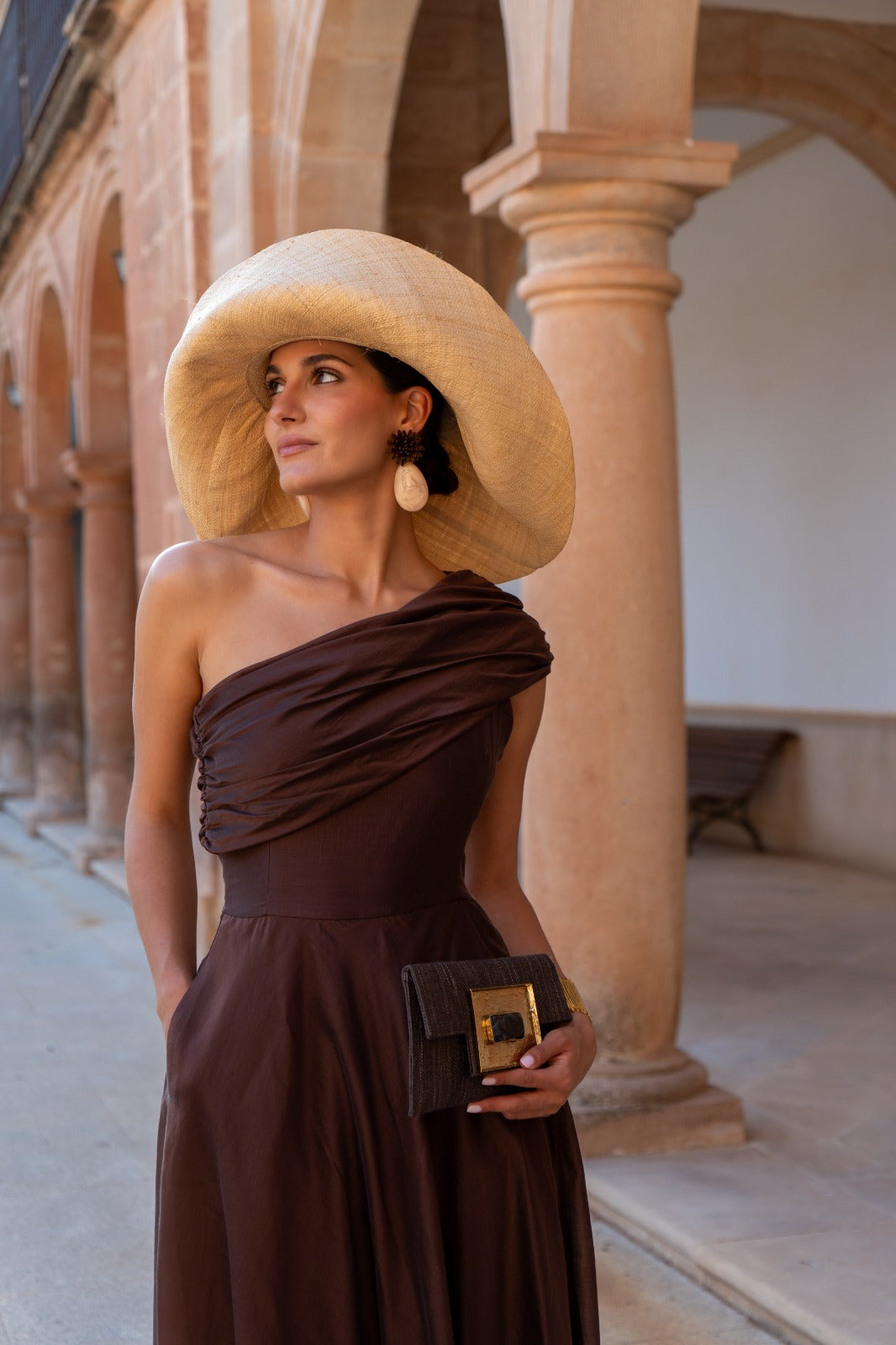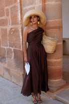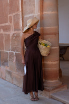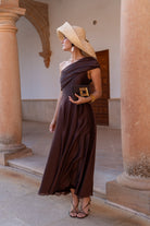 Vestido midi,  escote drapeado asimétrico, corte en cintura, bolsillos laterales, falda evasé, con vuelo. En color marrón.