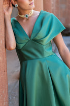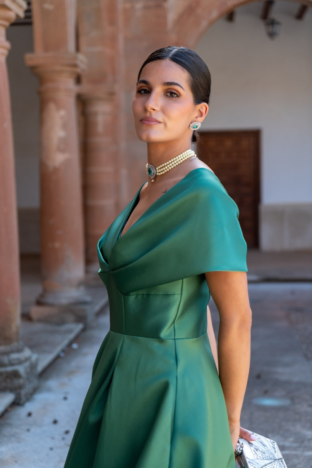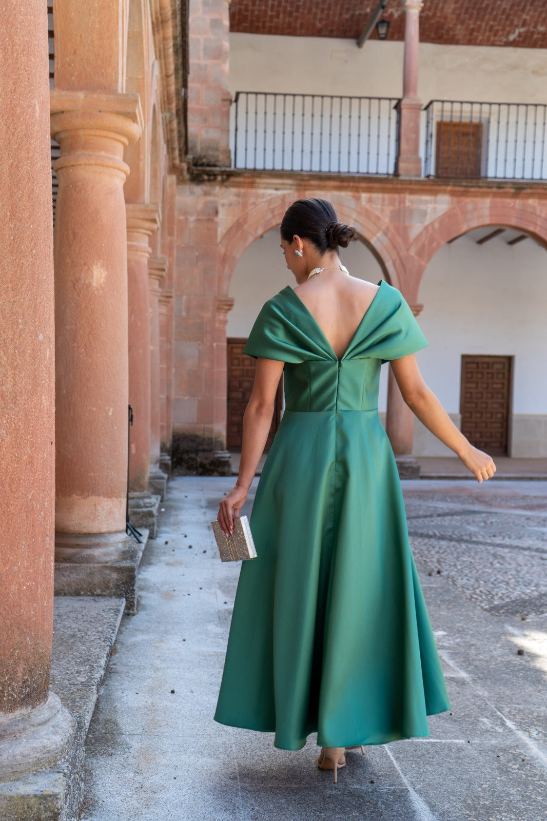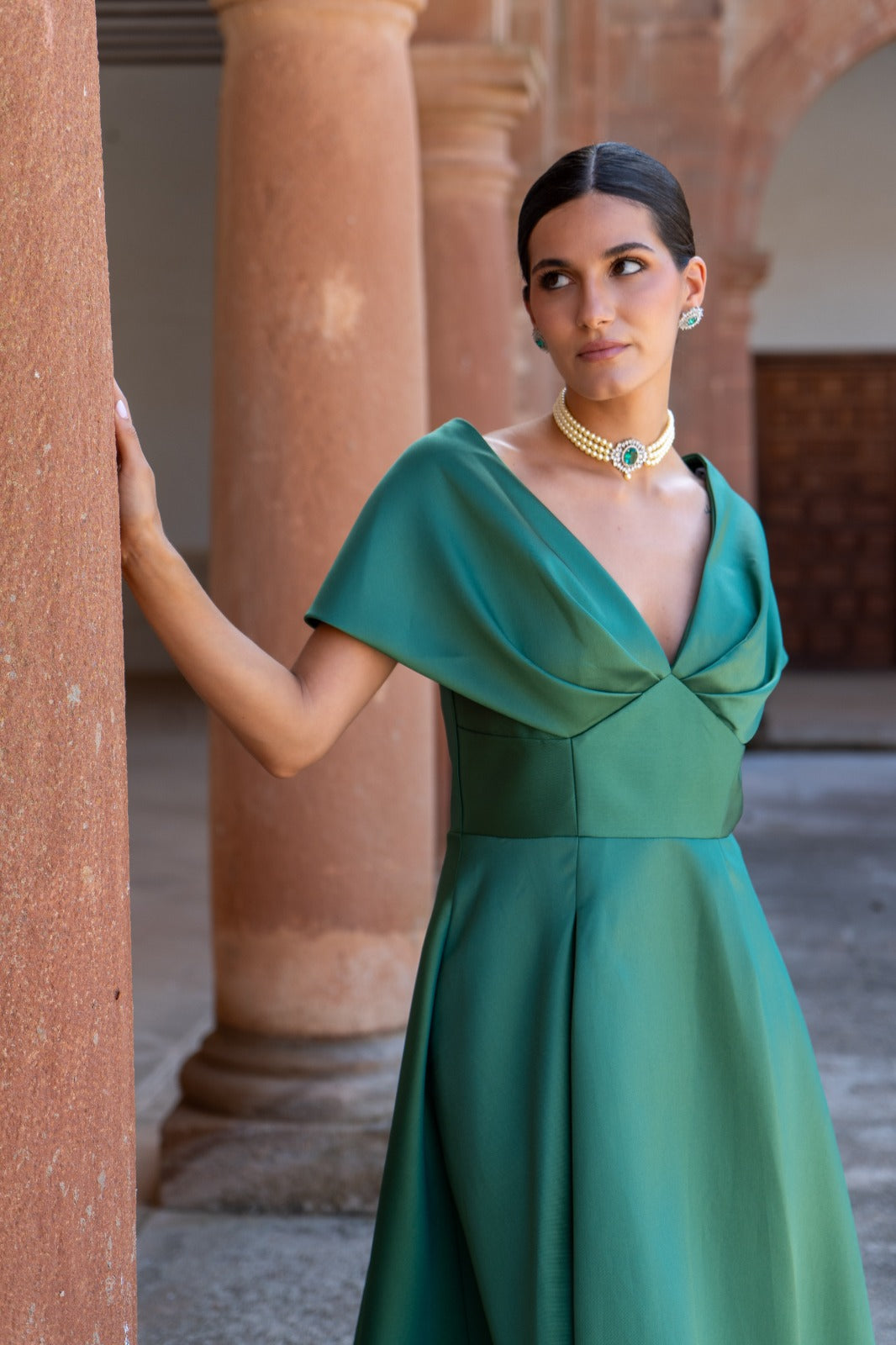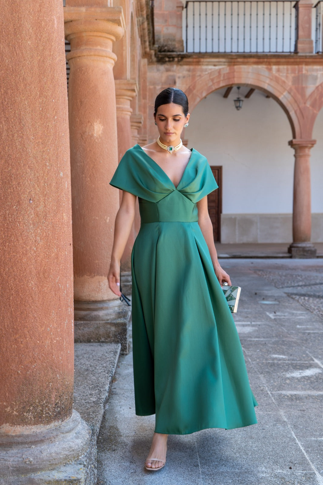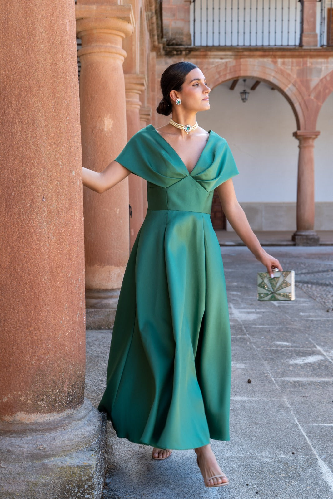 Vestido largo, escote a pico, hombro caído, corte en cintura, falda evasé. En tejido rigido color verde.