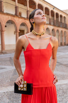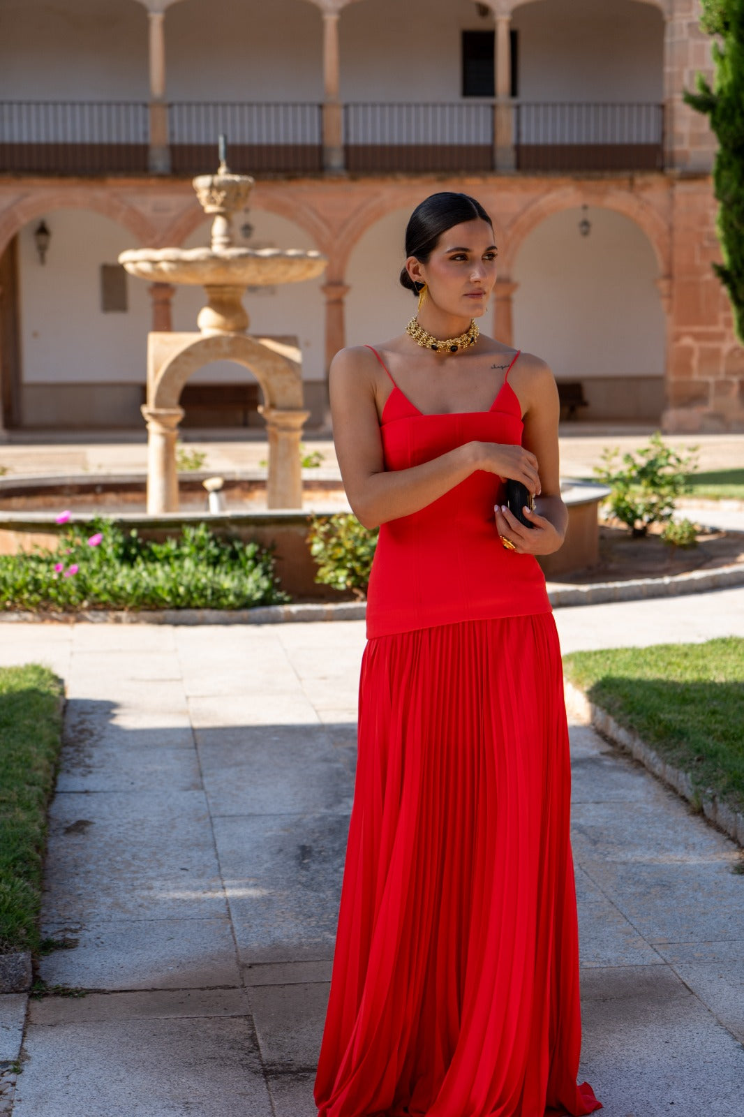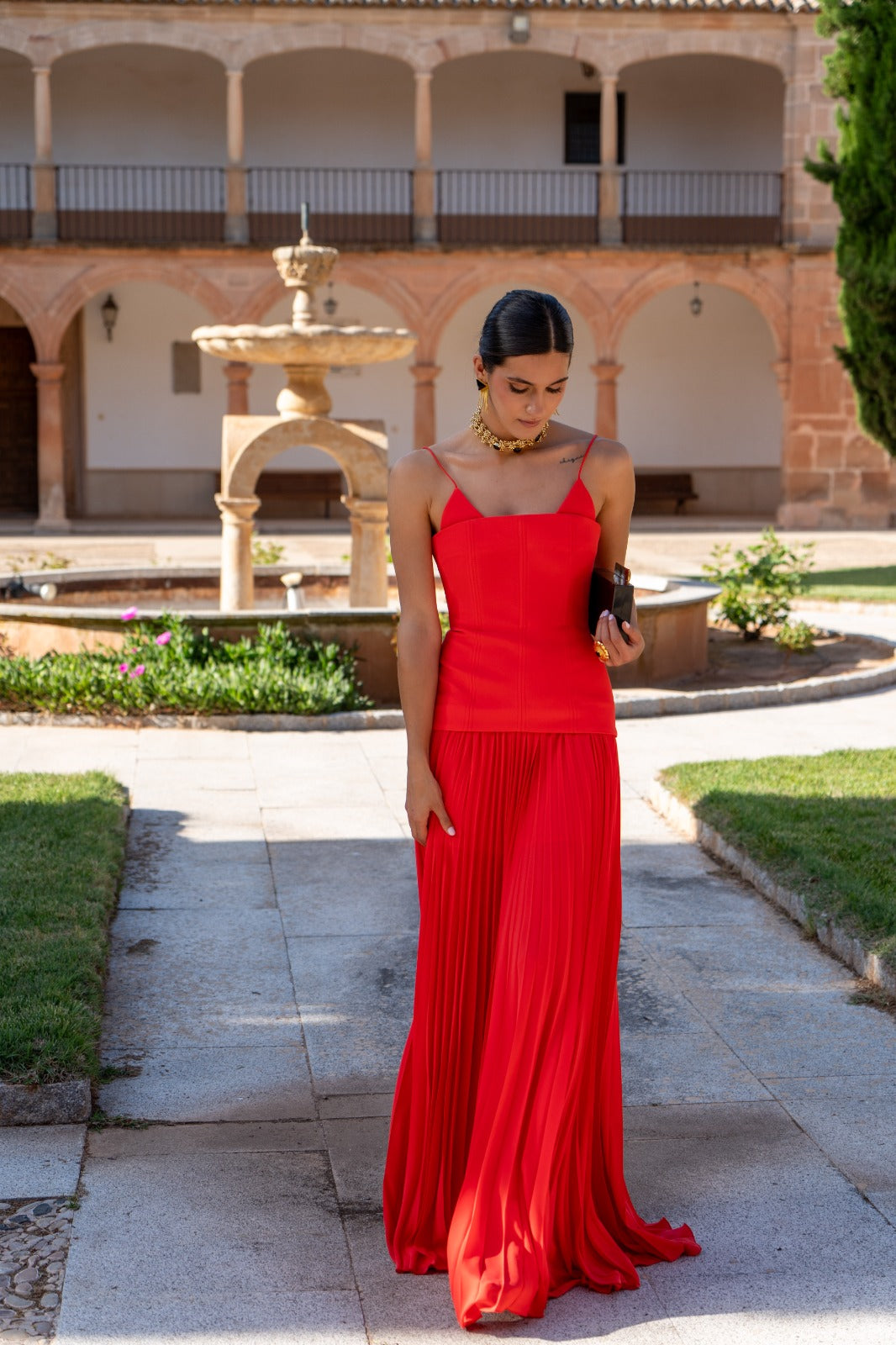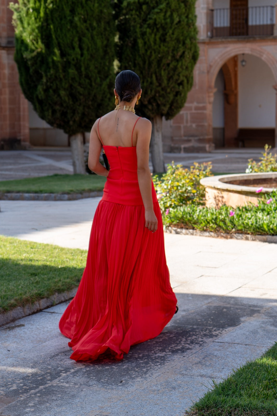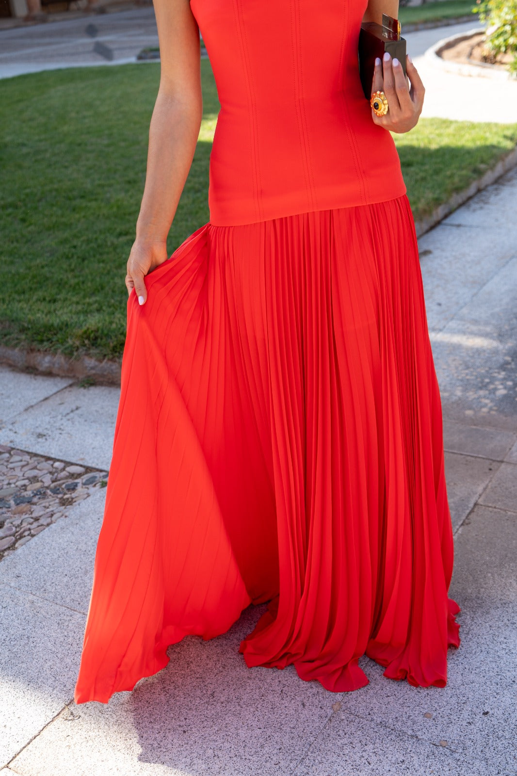 Vestido largo de crepé con cuerpo corsetero pespunteado que se encuentra unido sobre la falda plisada. En color coral.