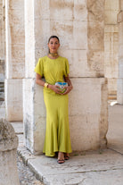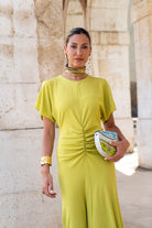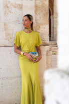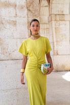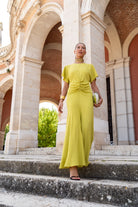 Vestido largo escote redondo, manga corta abierta, fruncido en cintura, vuelo abajo. En color oliva.