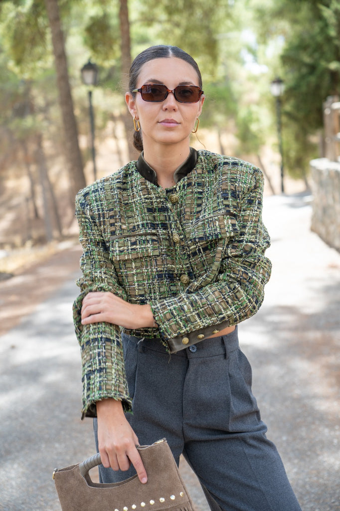 Chaqueta corta, escote redondo, manga larga, abotonada, bolsillos delanteros. En color verde.