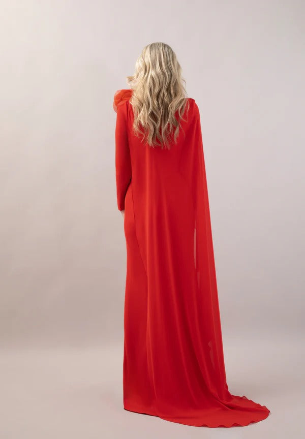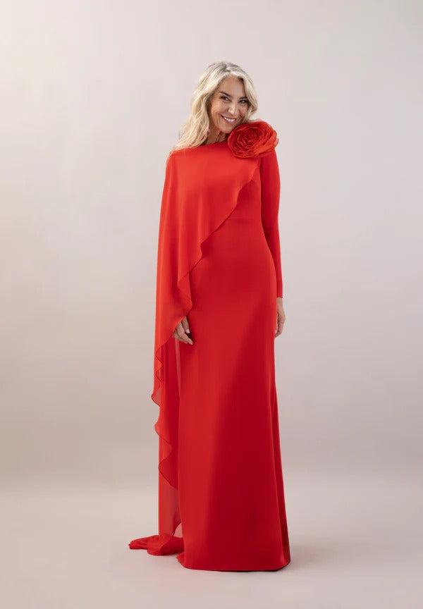 Vestido de crepé con escote barco y manga larga. Corte en la cintura con falda sirena. Capa de gasa asimétrica que cae en diagonal sobre el cuerpo delantero hasta el bajo de la espalda. Flor al tono realizada a mano sobre el hombro.
