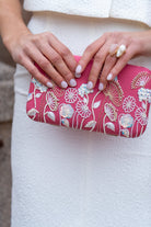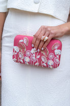 Bolso ovalado, con pomo dorado, cadena larga para colgar. Flores bordadas en hilo metálico, la parte trasera es lisa en tela rosa coral.