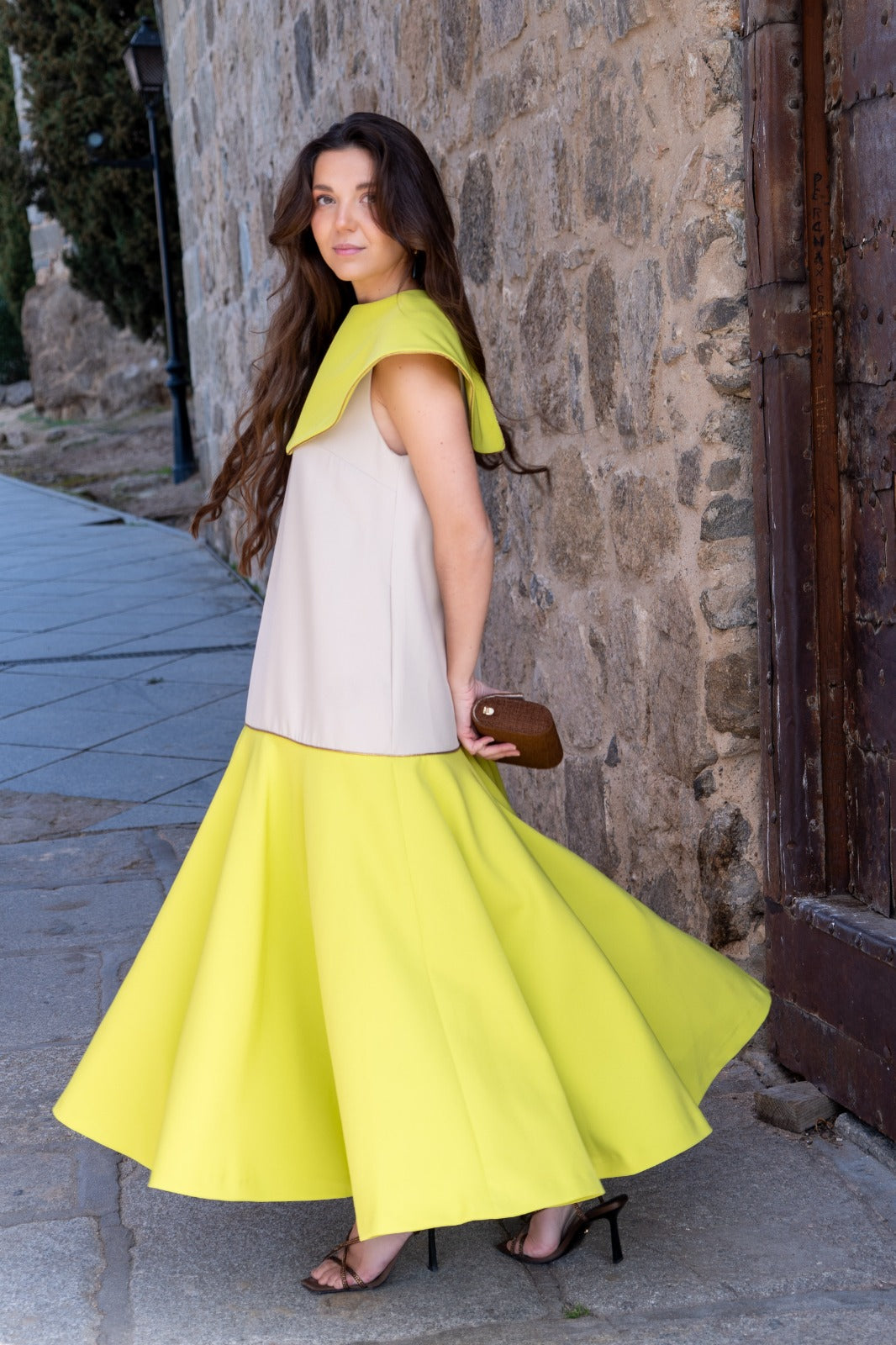 Vestido maxi midi, escote redondo, sin manga, bolsillos laterales, cuello que se quita y pone. Bicolor beige y lima.