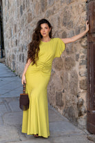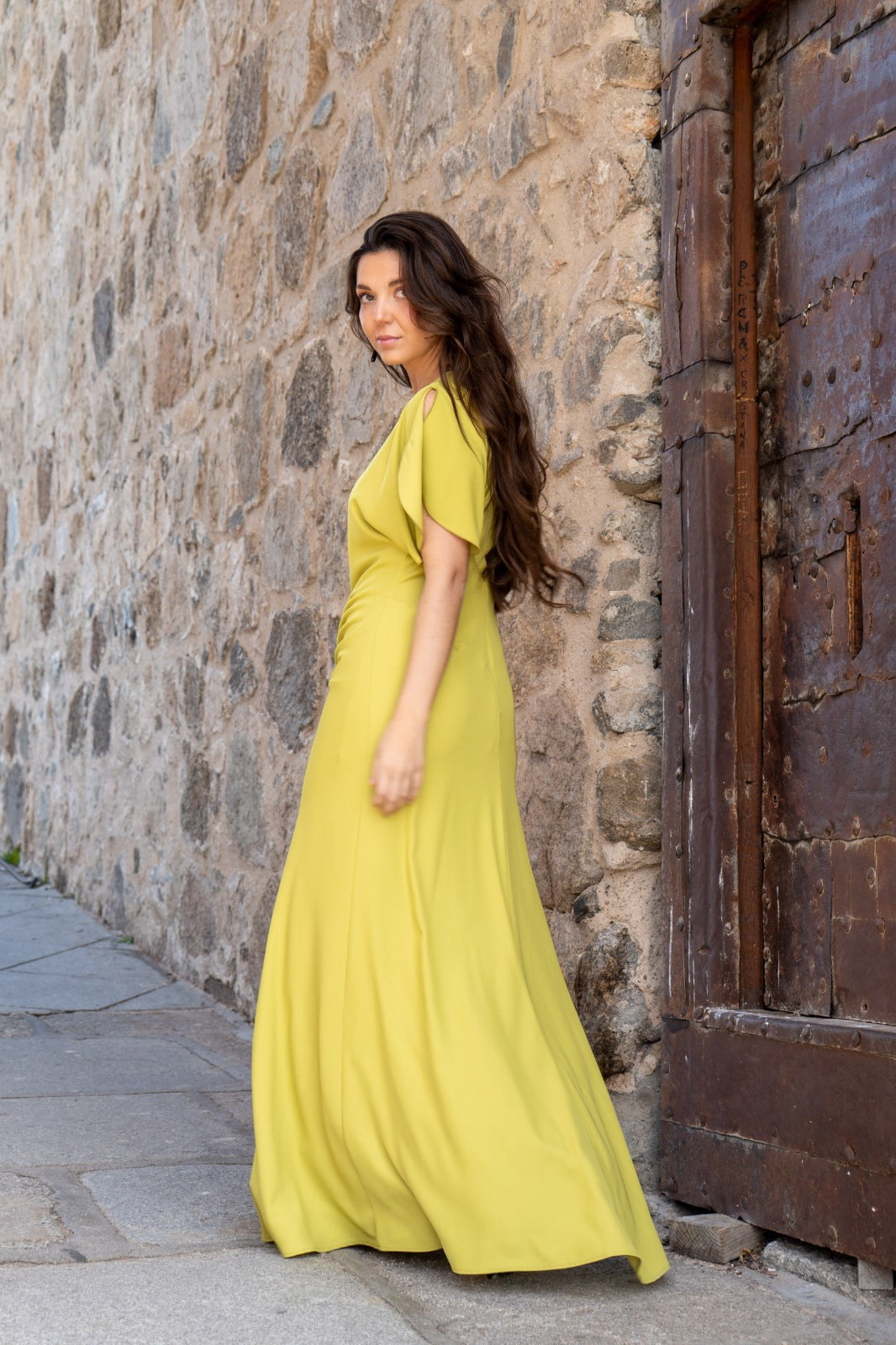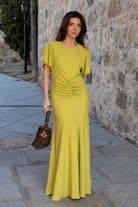 Vestido largo escote redondo, manga corta abierta, fruncido en cintura, vuelo abajo. En color oliva.
