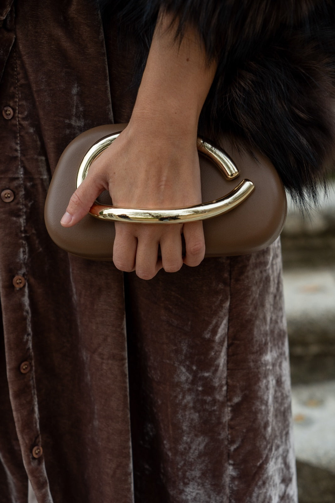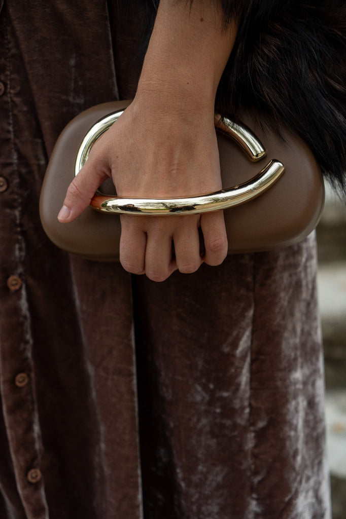 Cartera rígida, cierre con imán, detalle dorado para poder sujetar, en color marrón.