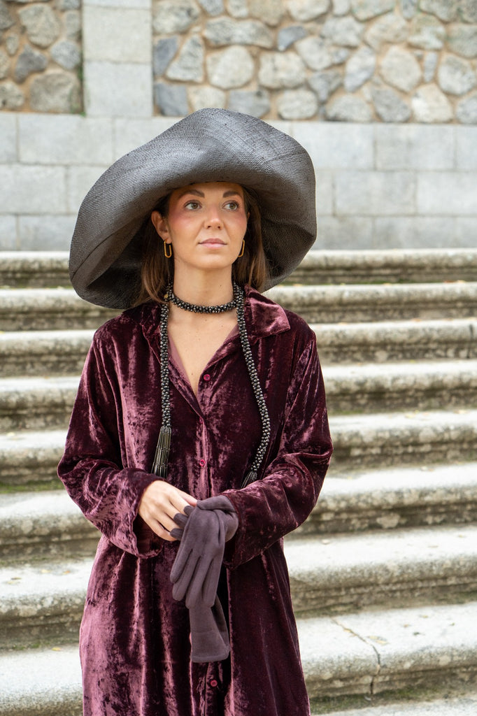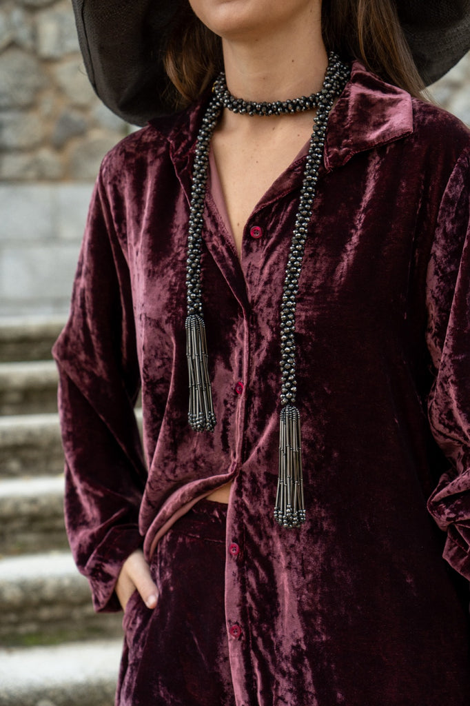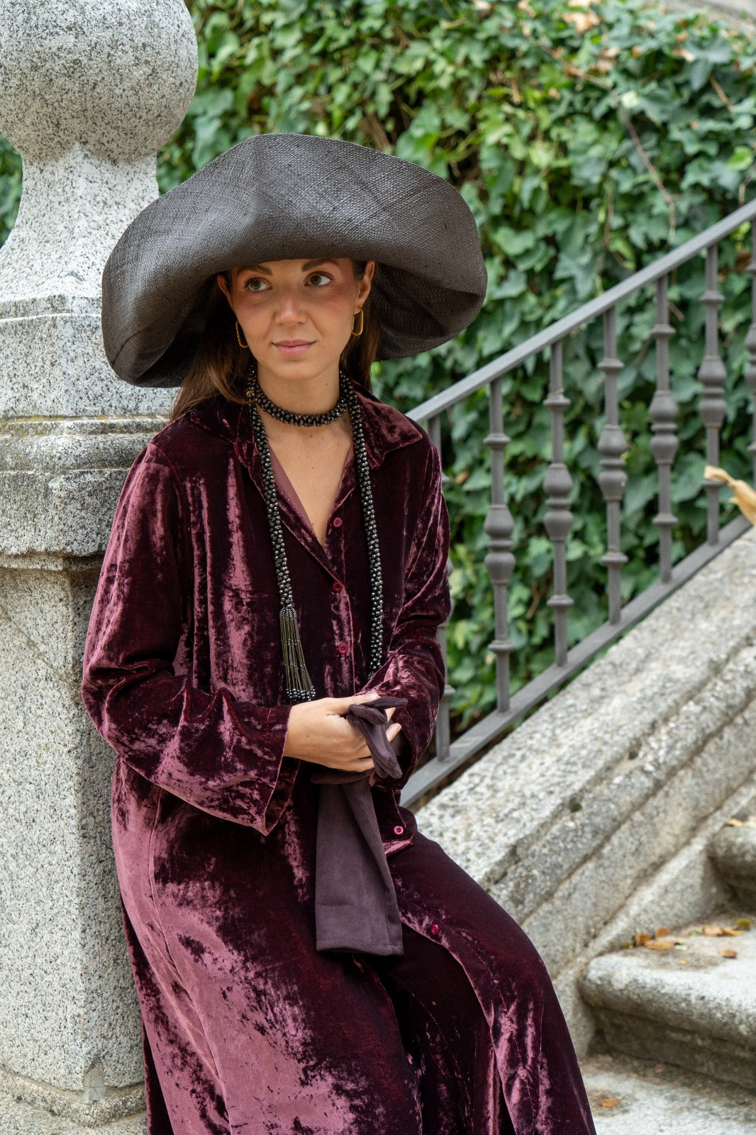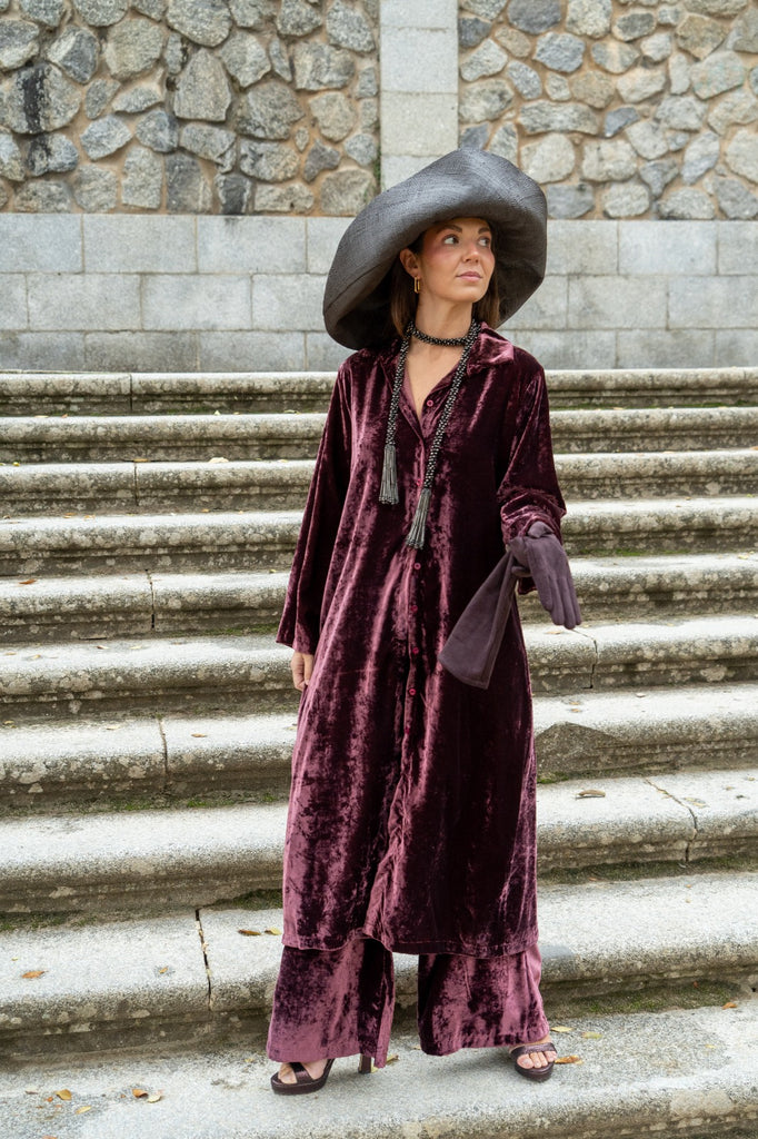 Conjunto formado por kaftan manga larga, abotonado y pantalón cintura engomada, bolsillos laterales. En color burdeos.